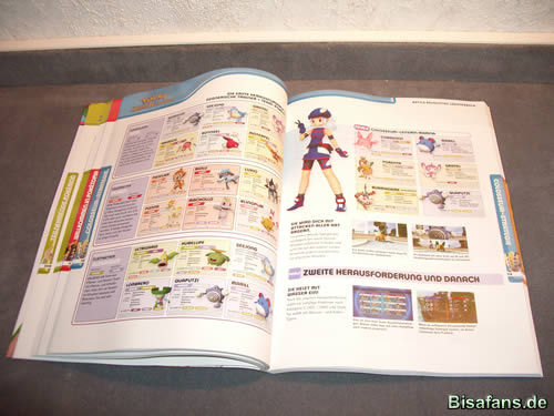 Auf 66 Seiten werden hier 482+8 Pokemon mit Bild und Text vorgestellt. Die Pokemon sind dabei sehr sinnvoll nach Typen wie z.B. Feuer, Boden oder Elektro sortiert und mit den wichtigsten Spieldaten versehen (Pokemon-Typ, Spezialfähigkeiten, Attacken-Empfehlungen sowie Angaben, wo die Pokemon in PBR auftauchen). Besonders gelungen sind hier die vier Attacken-Empfehlungen pro Pokemon, die auch noch farblich markiert sind um deren Herkunft (normale Entwicklung, Ei-Attacke, Attacken-Helfer oder TM/VM) anzuzeigen. Für Spieler ebenfalls sehr wichtig ist die Angabe, wo die Pokemon im Spiel auftauchen, da dies dabei helfen kann, die Pokemon in einen Leihpass zu bekommen.