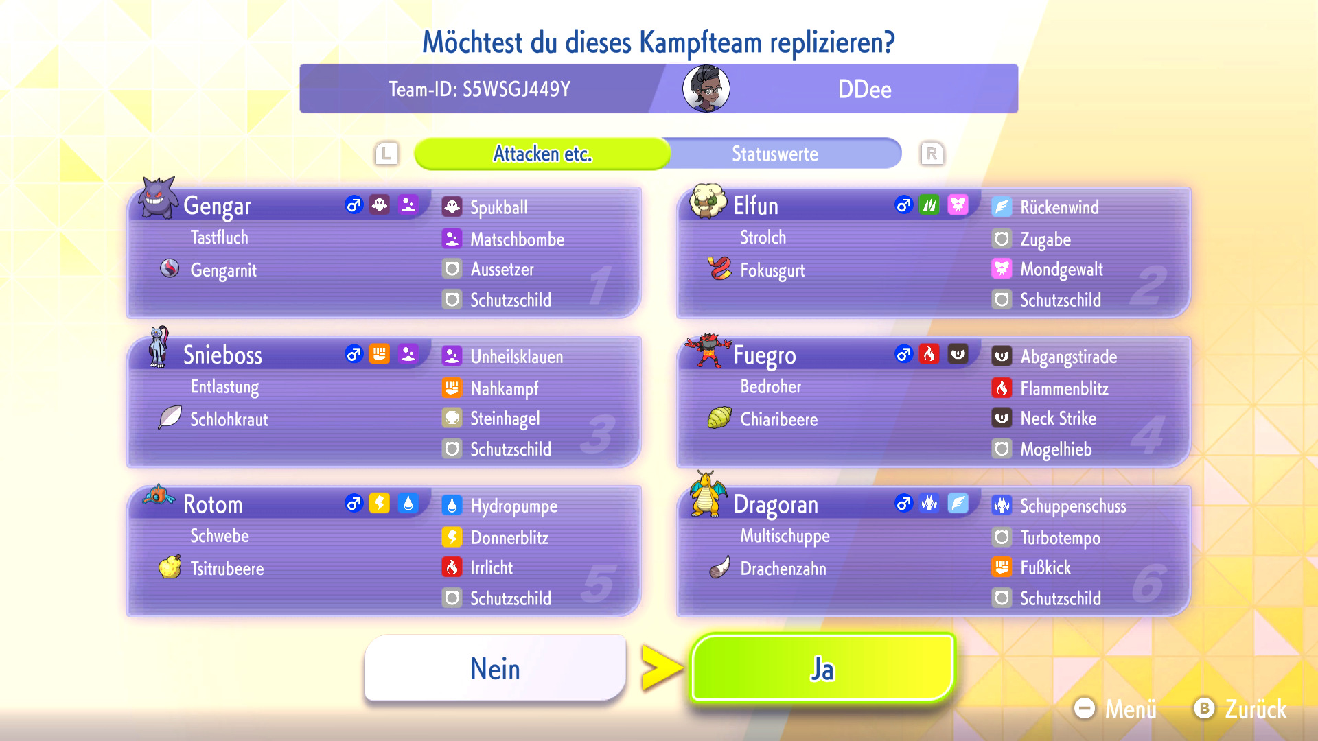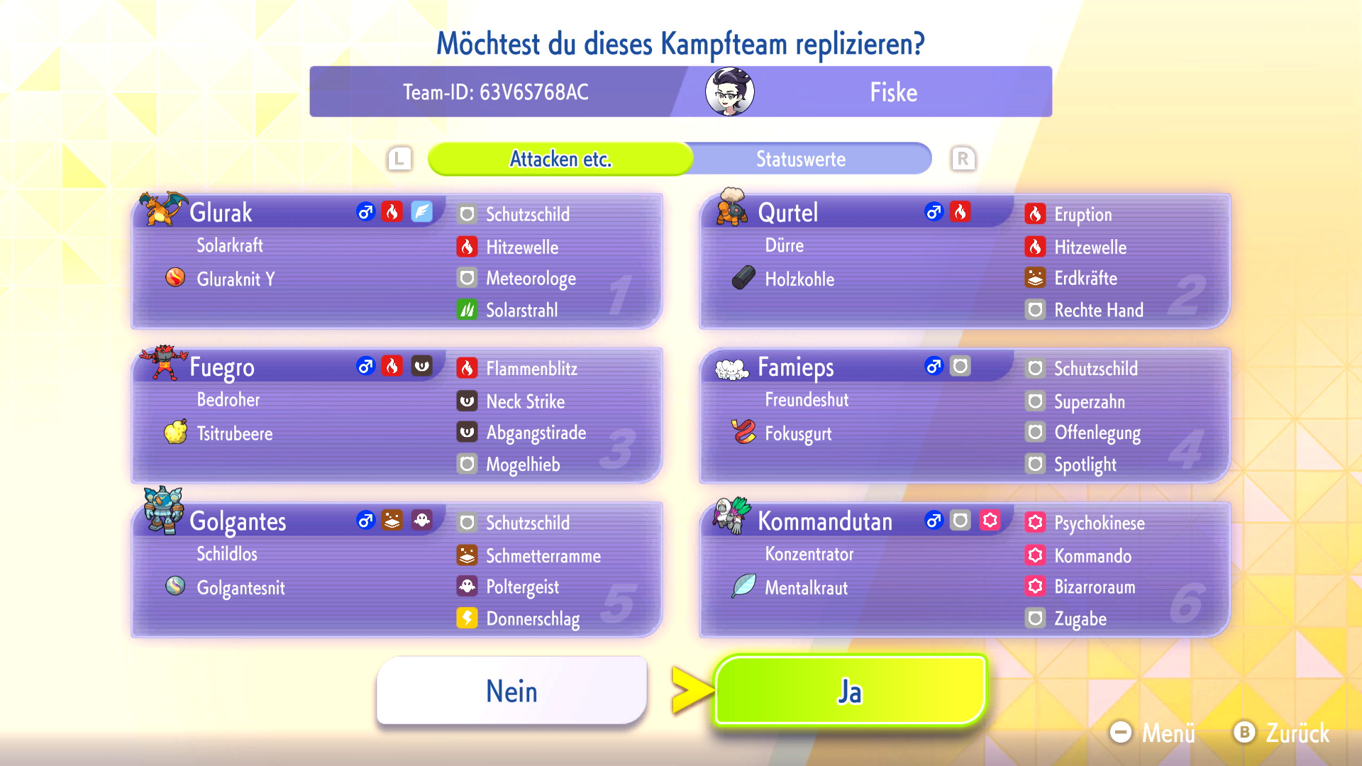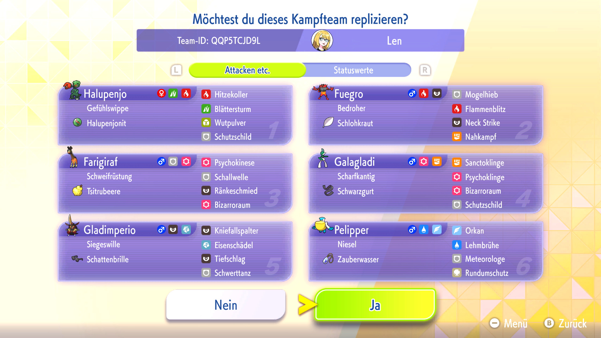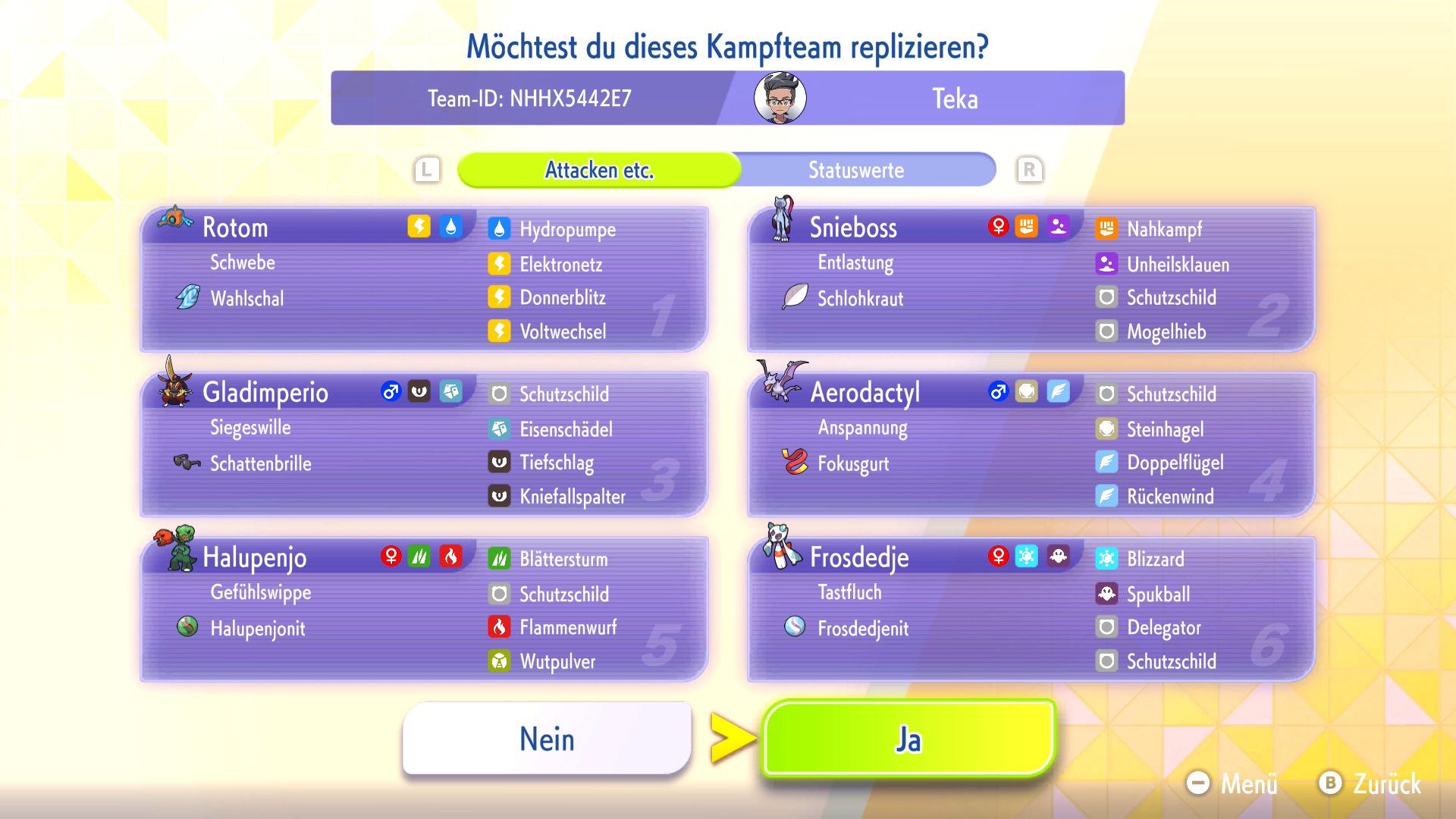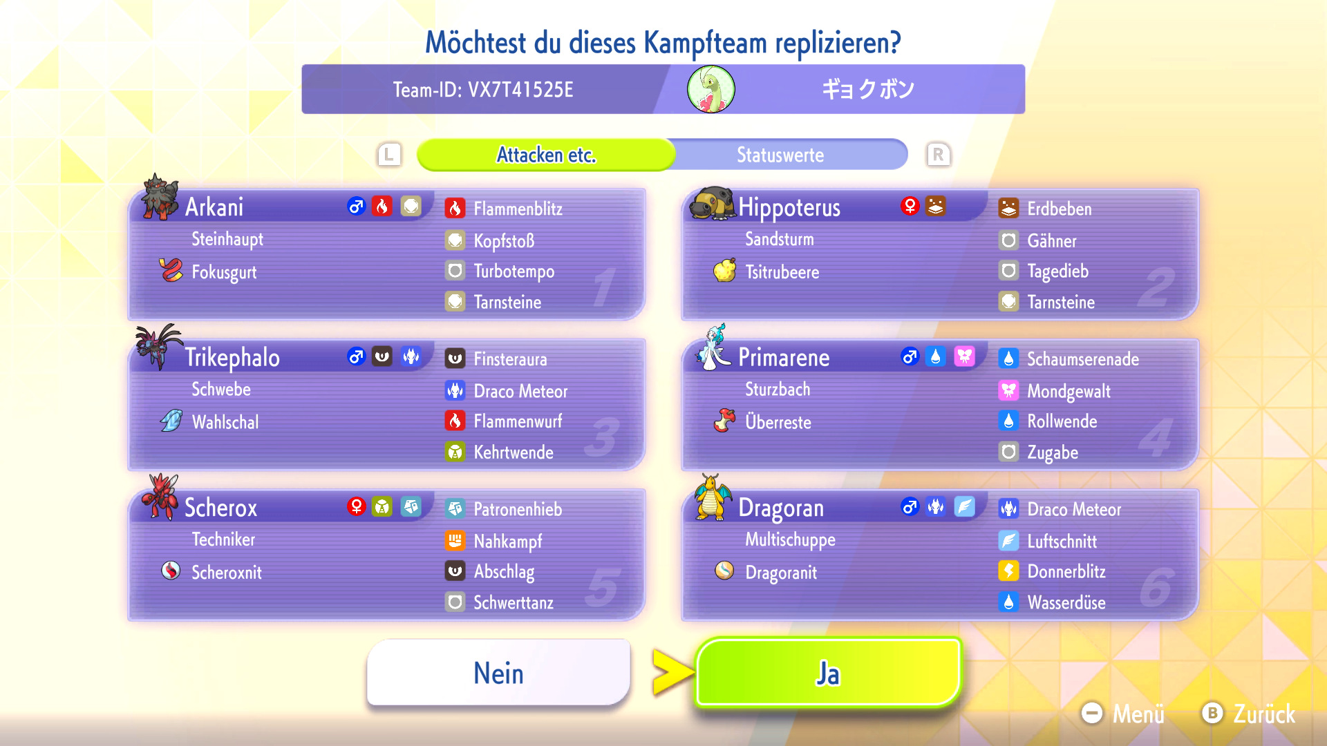 Habt ihr ein Replika-Team in eurem Spiel heruntergeladen, könnt ihr das Team mit euren eigenen Pokémon nachbauen oder euch inspirieren lassen. Zum Nachbauen müsst ihr die Pokémon und Items aus dem Replika-Team bereits besitzen und könnt dann automatisch euer geamtes Team nach eurem Vorbild mit VP trainieren.