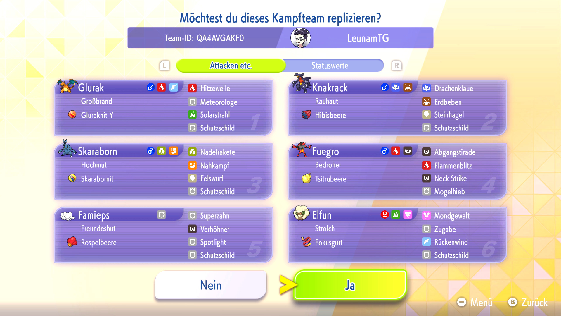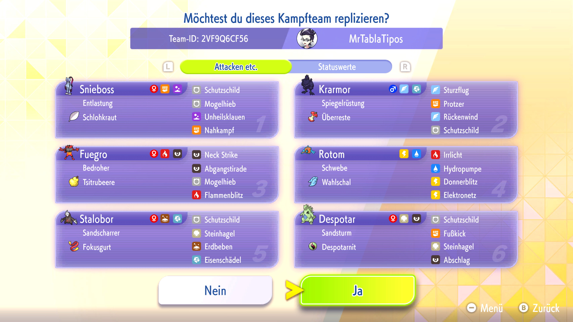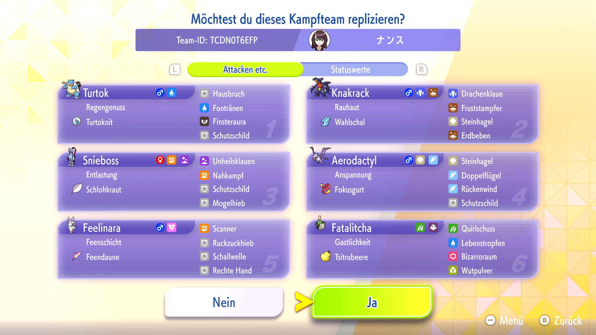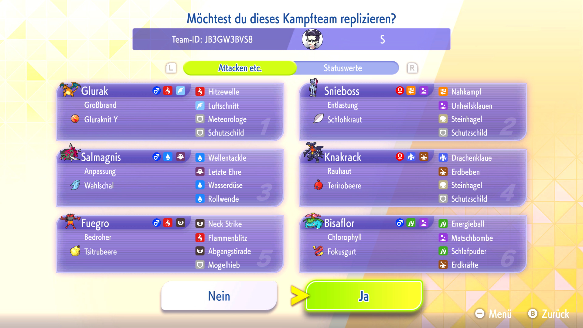 Habt ihr ein Replika-Team in eurem Spiel heruntergeladen, könnt ihr das Team mit euren eigenen Pokémon nachbauen oder euch inspirieren lassen. Zum Nachbauen müsst ihr die Pokémon und Items aus dem Replika-Team bereits besitzen und könnt dann automatisch euer geamtes Team nach eurem Vorbild mit VP trainieren.