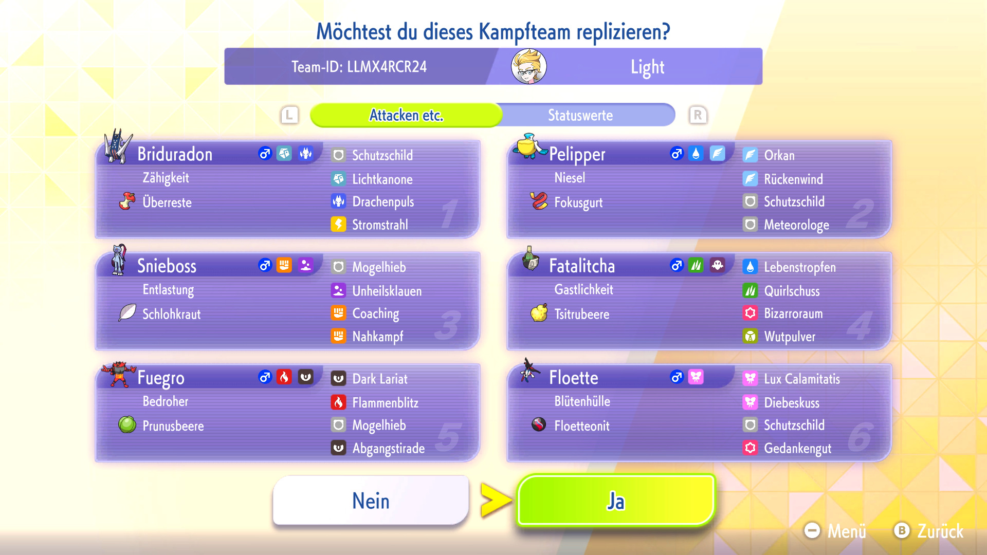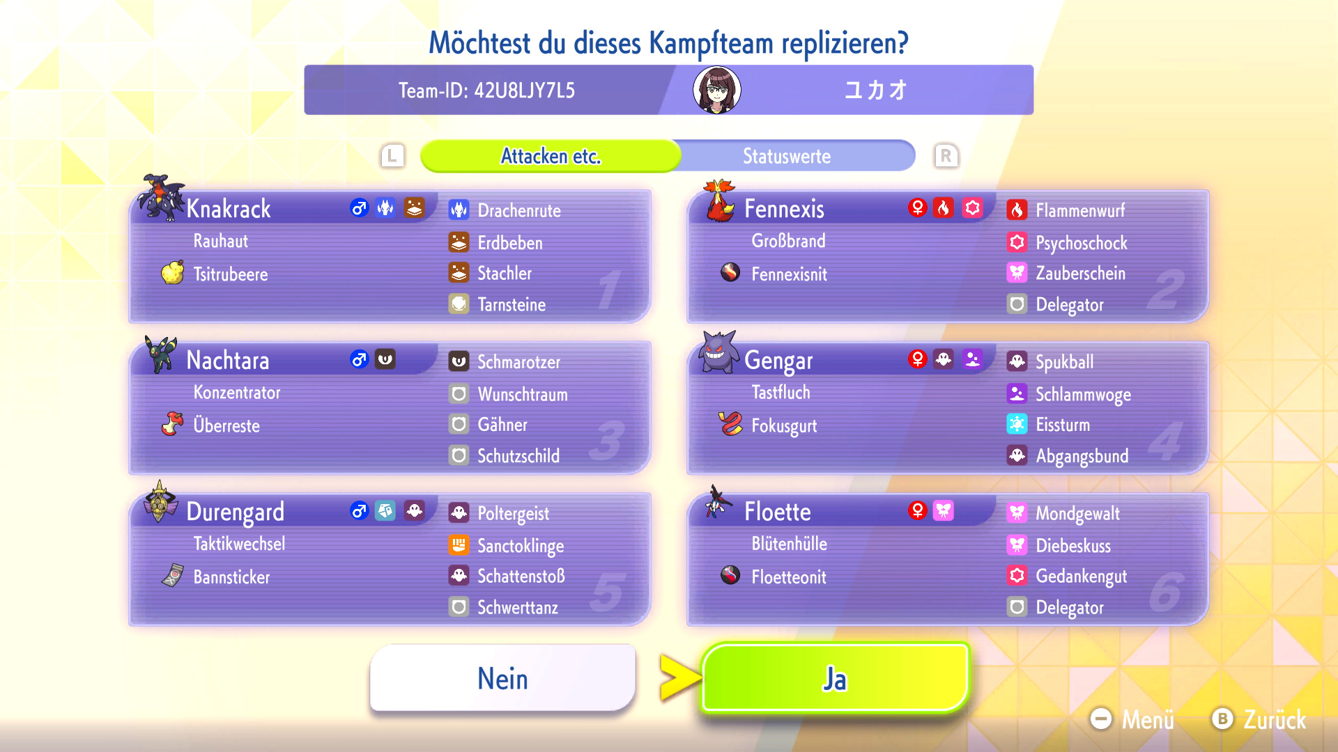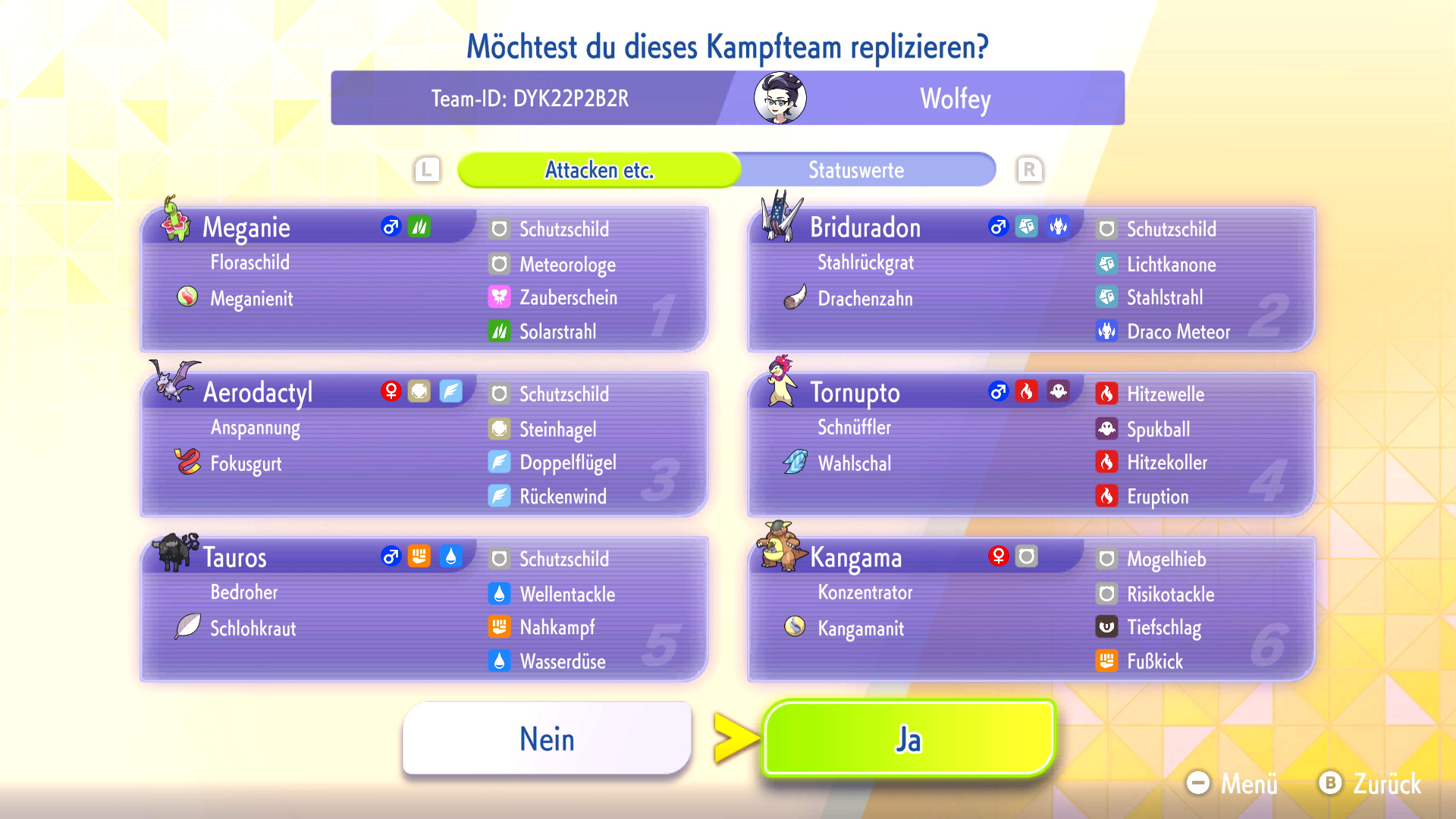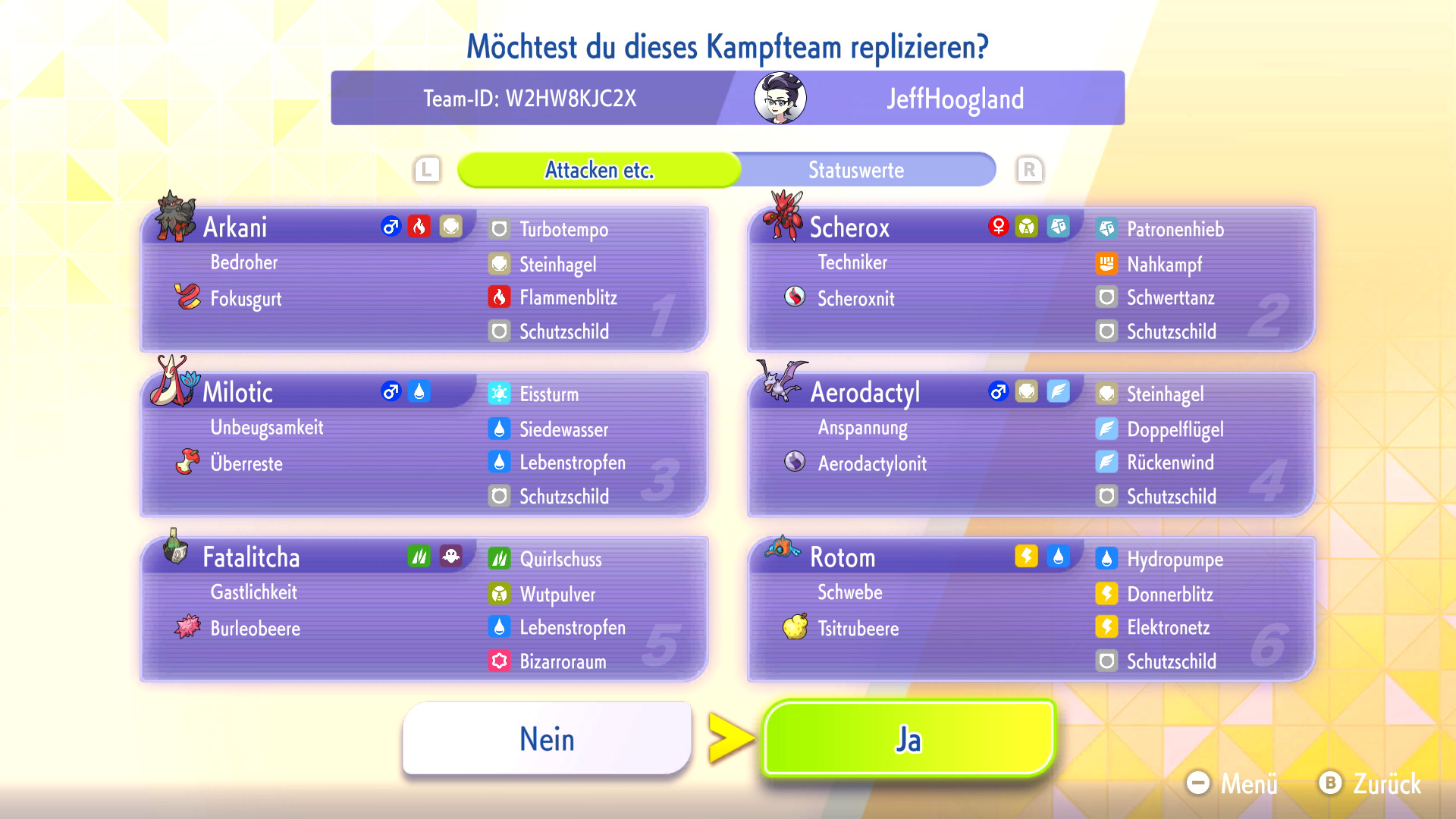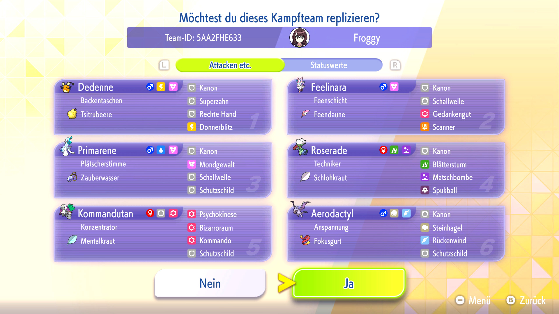 Habt ihr ein Replika-Team in eurem Spiel heruntergeladen, könnt ihr das Team mit euren eigenen Pokémon nachbauen oder euch inspirieren lassen. Zum Nachbauen müsst ihr die Pokémon und Items aus dem Replika-Team bereits besitzen und könnt dann automatisch euer geamtes Team nach eurem Vorbild mit VP trainieren.