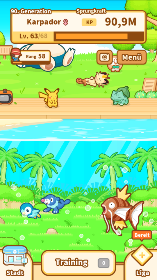 Der Hauptteil des Spieles findet in einem Aquarium statt, in welchem Karpador gefüttert werden kann. Hierbei kann man mit dem Abschluss verschiedener Ligen weitere Stile von Aquarien freischalten, und so frei wählen, wie das eigene aussehen soll.