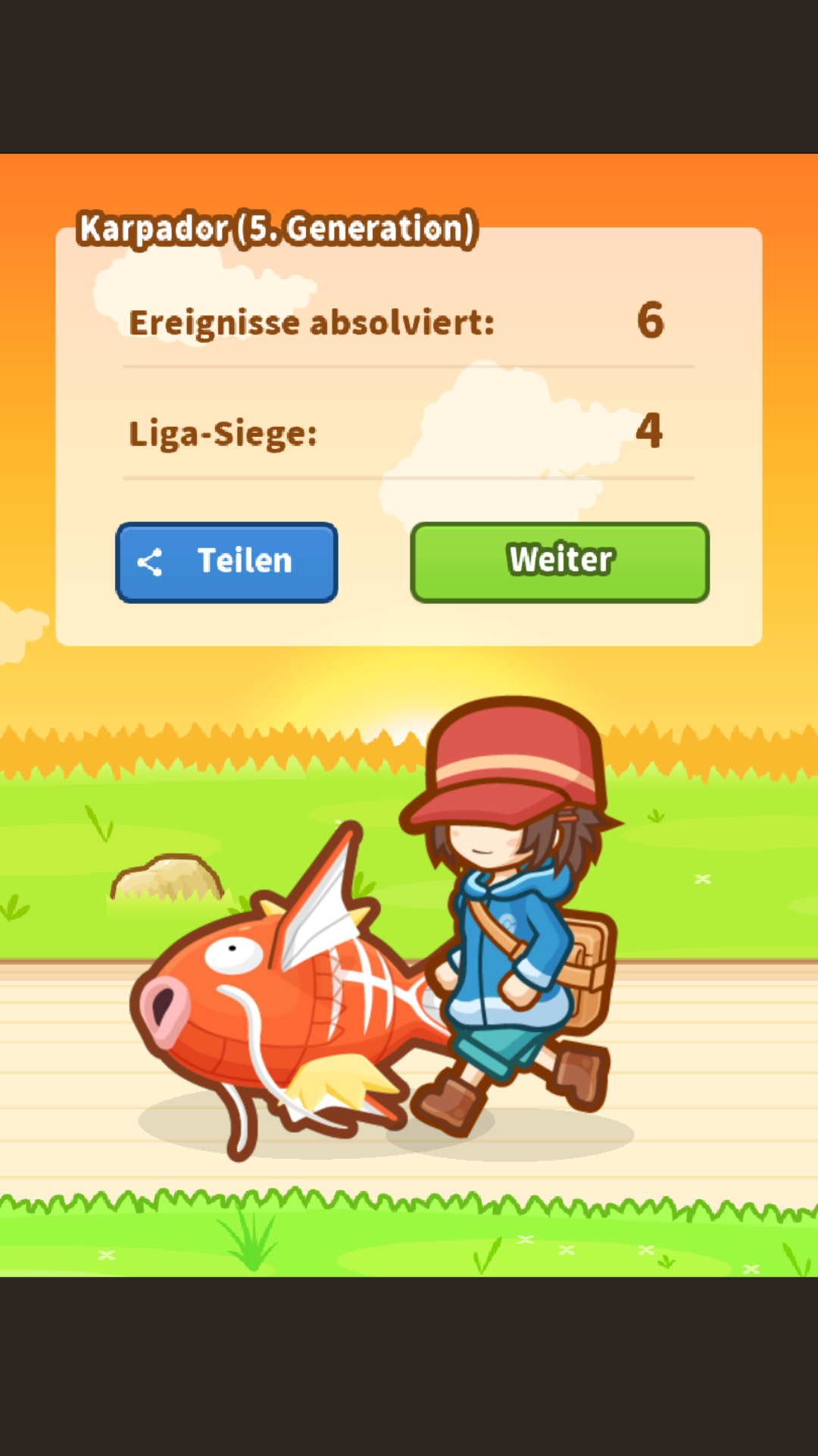 Sobald sich euer Karpador zu Garados entwickelt, wird automatisch ein Generationswechsel durchgeführt. Bei den Liga-Wettkämpfen sind schließlich nur Karpador zugelassen.