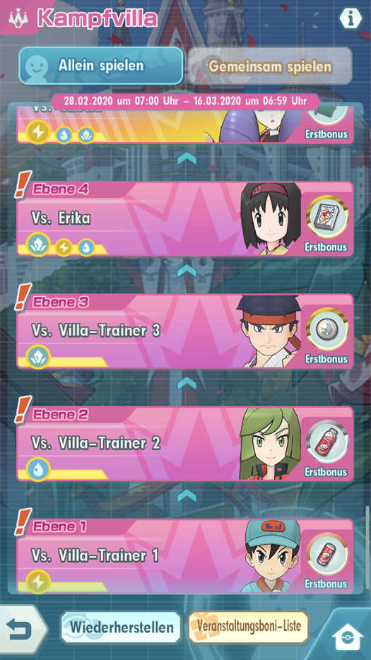 Die Kampfvilla umfasst eine bestimmte Anzahl an Ebenen (aktuell: 30 Ebenen), durch die ihr euch im Veranstaltungszeitraum (zu Villa-Resets siehe unten) durcharbeiten könnt. Auf jeder Ebene erwarten euch Kämpfe mit drei oder teilweise sogar mehreren gegnerischen Pokémon, auf die ihr euch genau vorbereiten könnt: In der Vorschau seht ihr, welche Typen hier einen Vorteil haben, da sie sehr effektiv sind. Außerdem könnt ihr unter Details auch besondere Tipps zum Boss erhalten. Nutzt diese Informationen, da die Gegner mit zunehmendem Fortschritt sehr stark werden können.