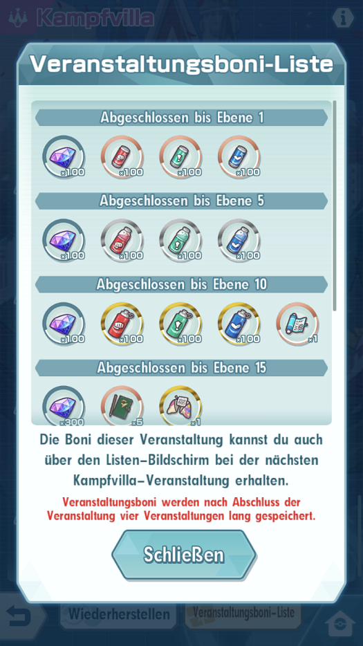 Durch das Bestreiten von Ebenen der Villa können besondere Belohnungen freigeschaltet werden. Welche dies sind hängt von der Anzahl an erfolgreich abgeschlossenen Ebenen der Villa ab. Zudem erhaltet ihr für jede absolvierte Ebene in der Kampfvilla Belohnungen.
