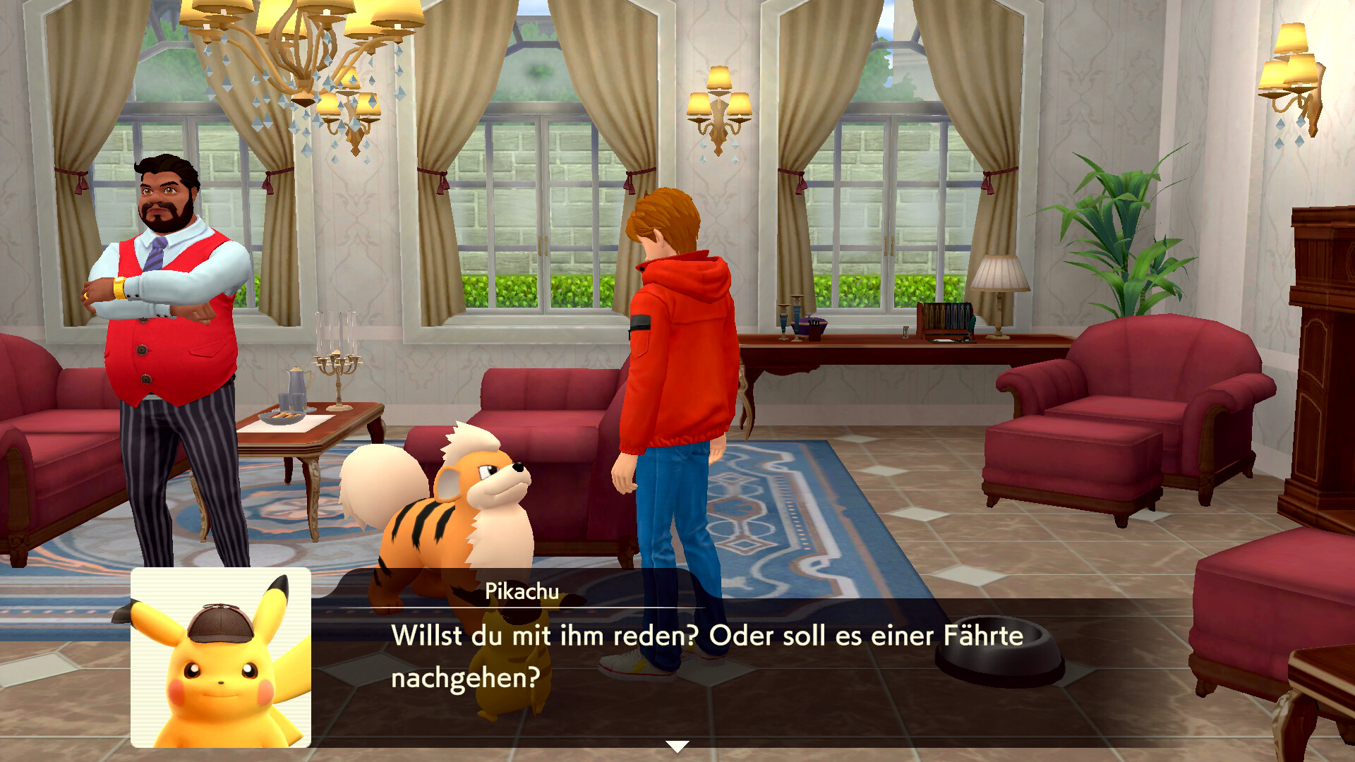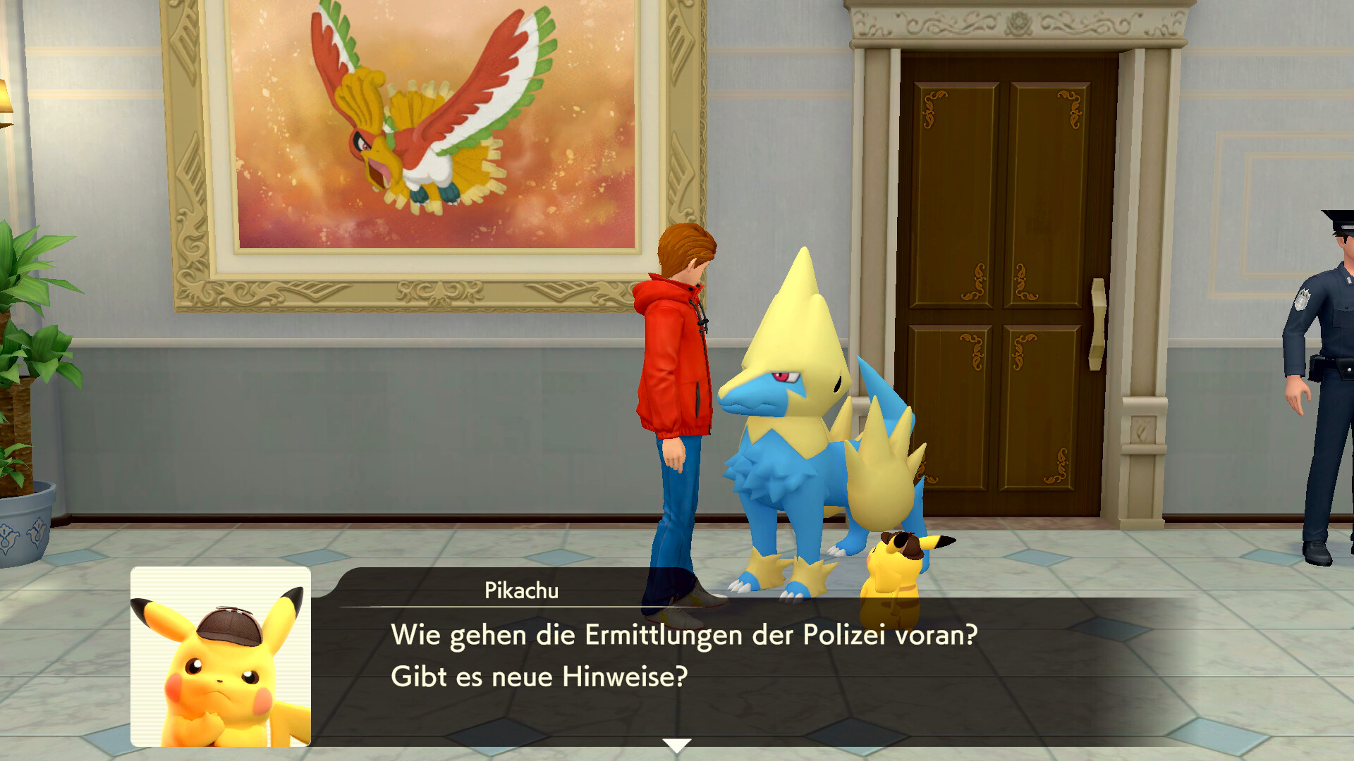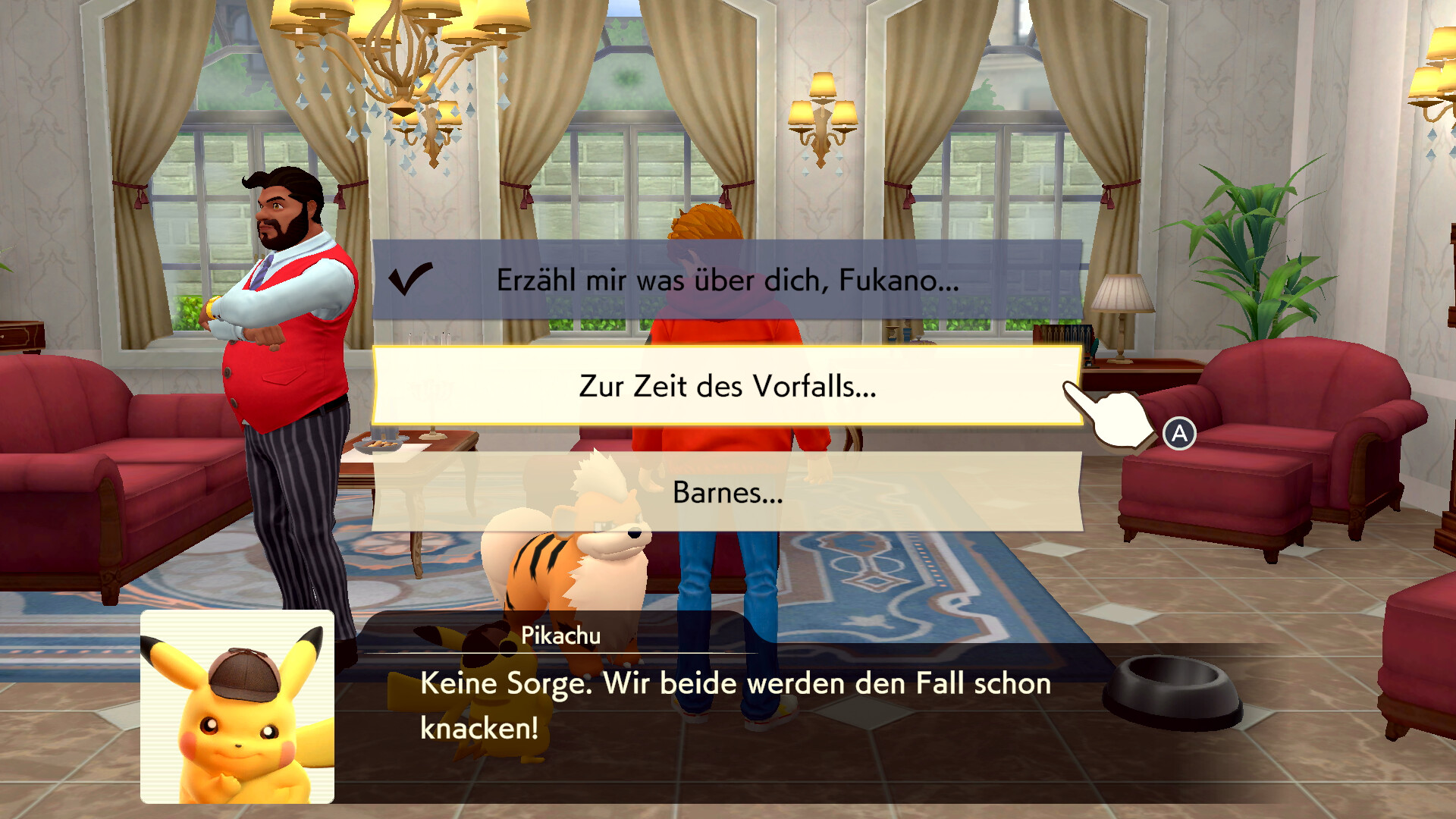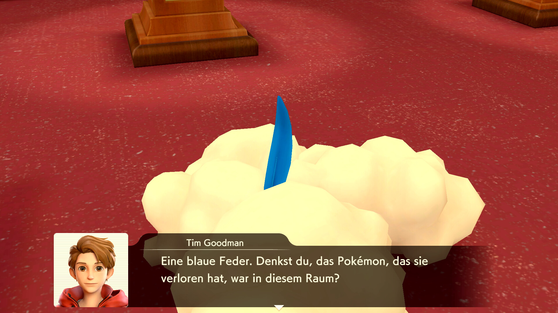 Geht nach dieser Schlussfolgerung aus dem Zimmer heraus und untersucht die Federn rechts am Fenster. Geht dann in das Erdgeschoss und sprecht mit Claudia Denis, die rechts steht. Sie erzählt euch von einem Piccolente, das der Partner von Larry Turner ist. Sprecht dann mit Larry Turner, der direkt neben Claudia steht. Er erzählt von einem roten Pokémon, das er gesehen haben will. Nachdem ihr noch einmal mit Sanjeev gesprochen habt, kommt Herr Barnes aus dem Verhörzimmer und ihr könnt mit ihm sprechen.