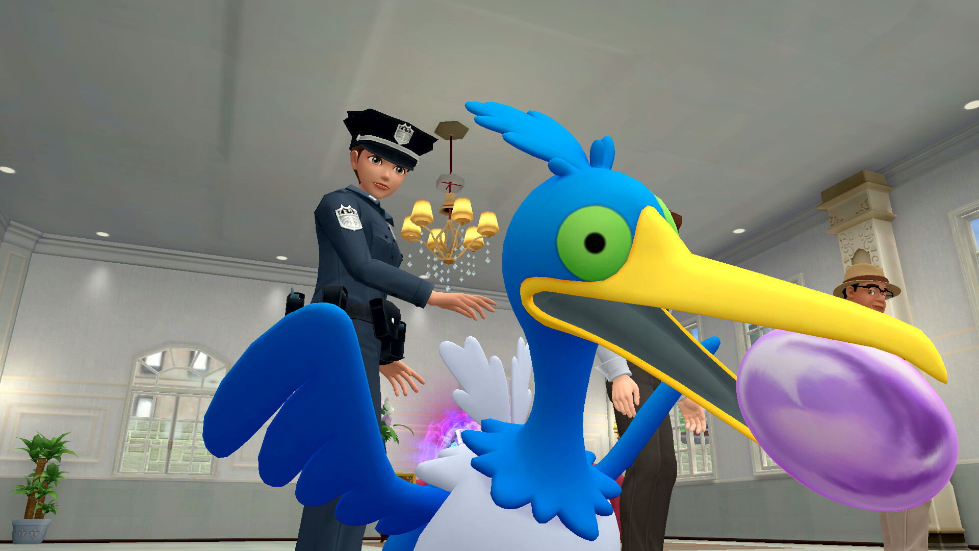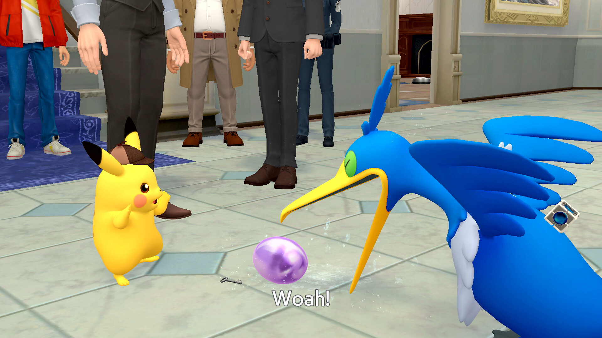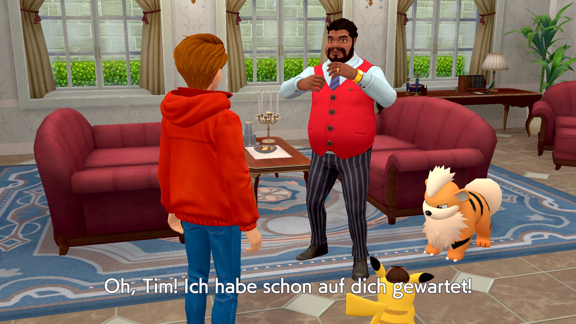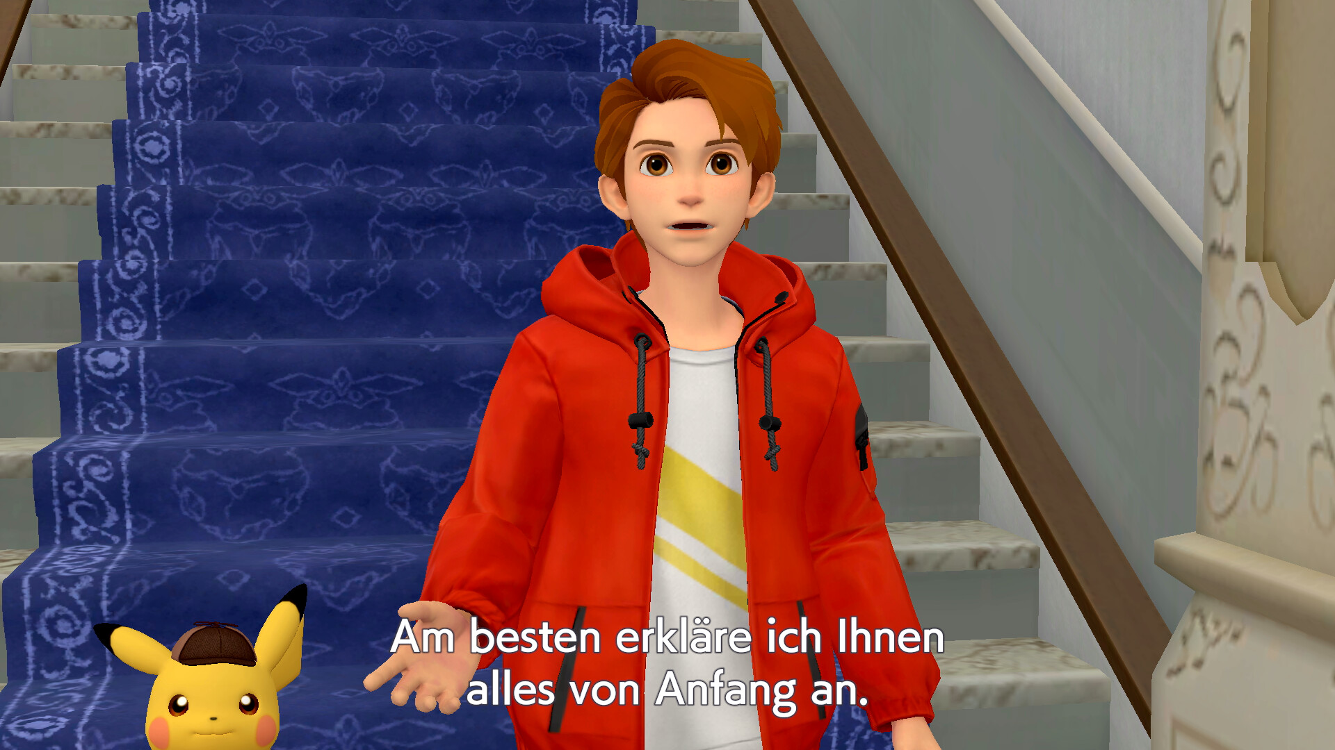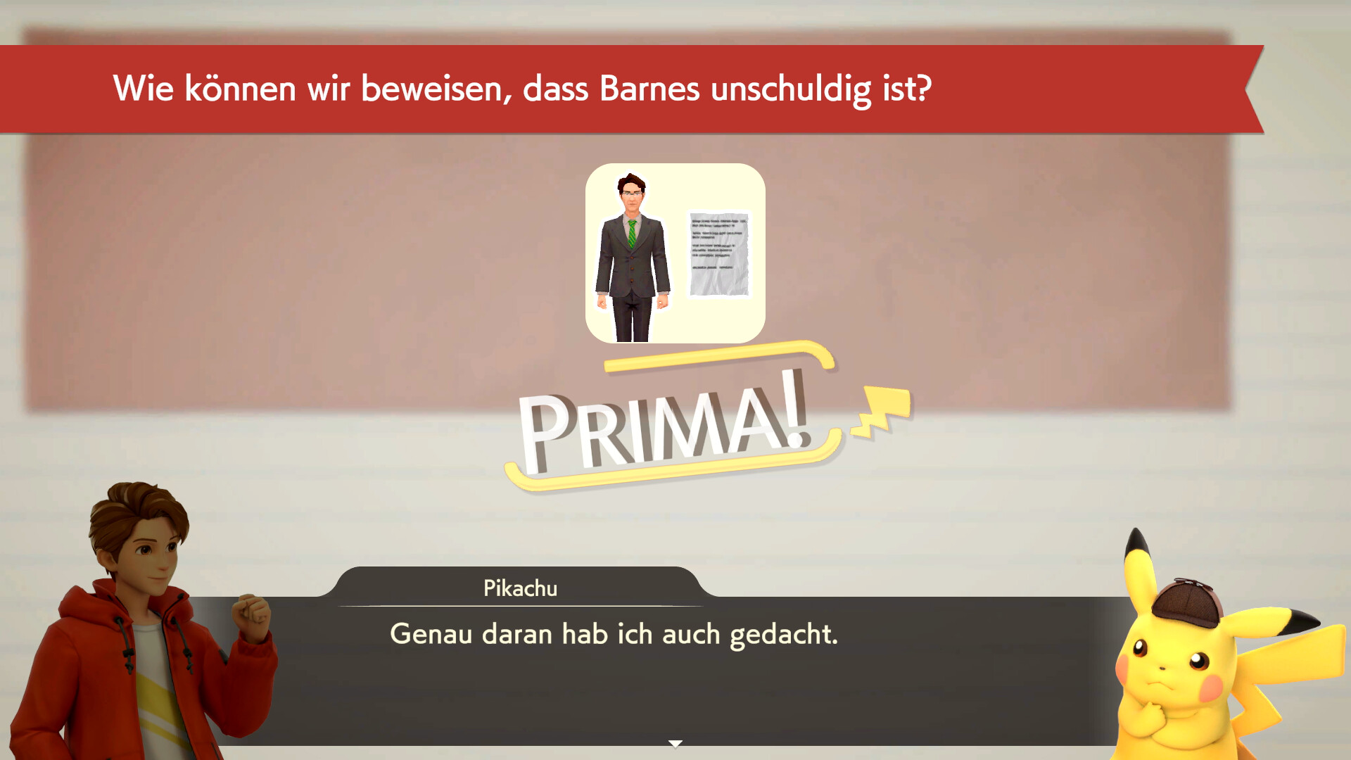 Geht nach dieser Schlussfolgerung aus dem Zimmer heraus und untersucht die Federn rechts am Fenster. Geht dann in das Erdgeschoss und sprecht mit Claudia Denis, die rechts steht. Sie erzählt euch von einem Piccolente, das der Partner von Larry Turner ist. Sprecht dann mit Larry Turner, der direkt neben Claudia steht. Er erzählt von einem roten Pokémon, das er gesehen haben will. Nachdem ihr noch einmal mit Sanjeev gesprochen habt, kommt Herr Barnes aus dem Verhörzimmer und ihr könnt mit ihm sprechen.