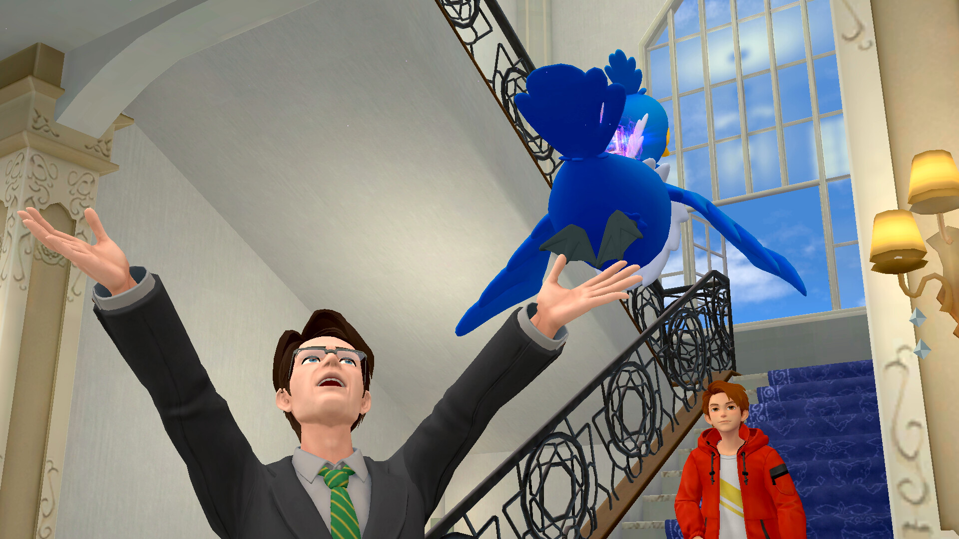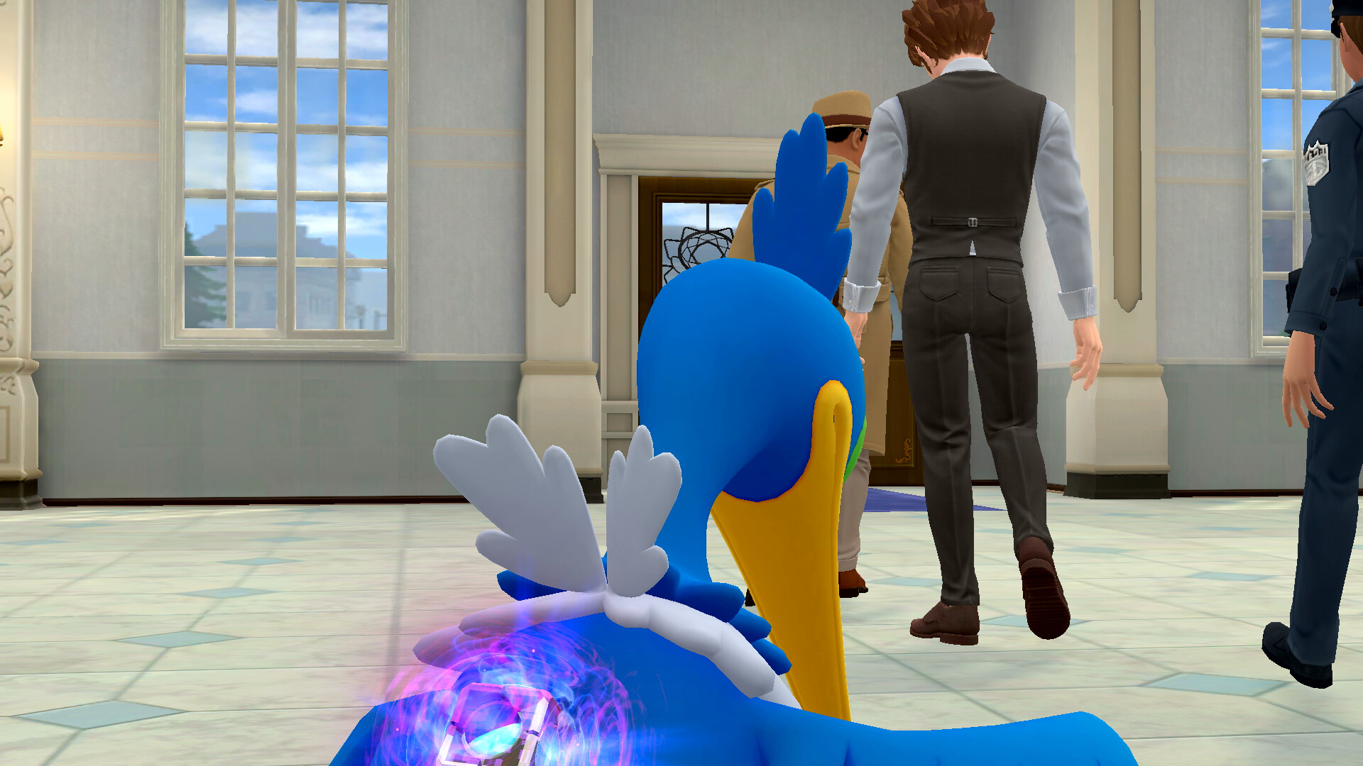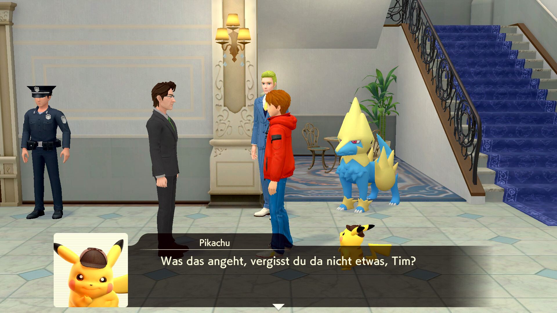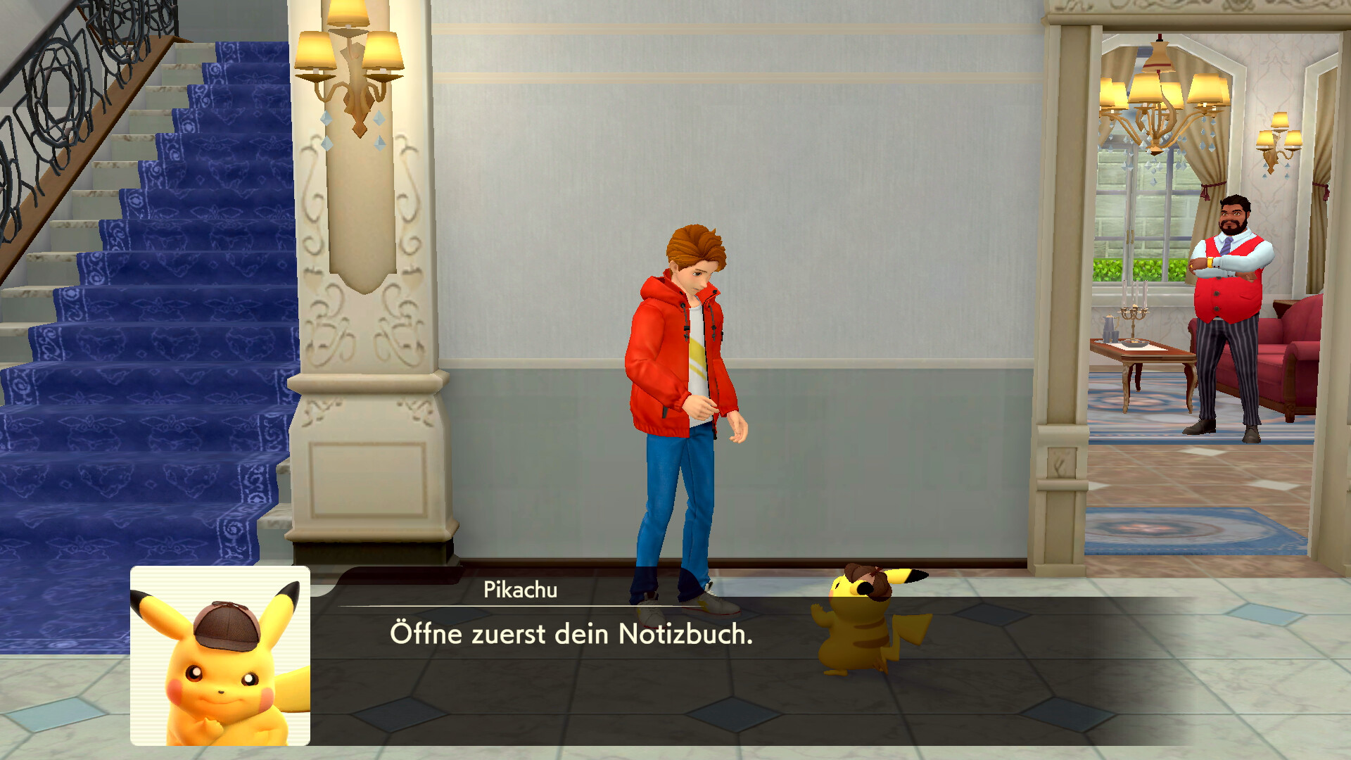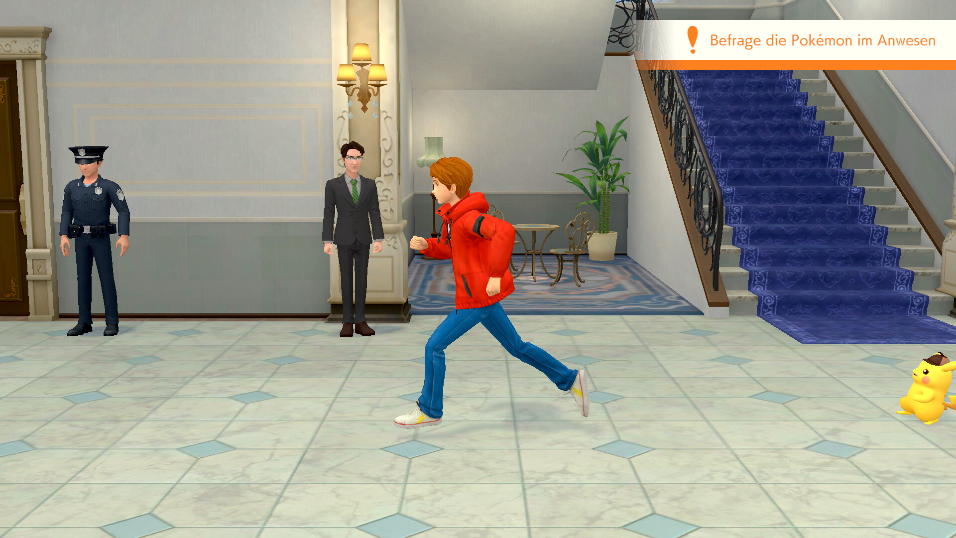 Am nächsten Tag gehen die beiden in Richtung des Cafés in Ryme City, als plötzlich Kommissar Holiday auftaucht und von einem Juwelendiebstahl berichtet. Er bittet euch um Hilfe. Folgt dem Kommissar also nach rechts zum Tatort bei der Denis-Residenz. Ihr trefft schließlich auf Brad McMaster und sein Voltenso und geht gemeinsam in das große Anwesen. Im Haus angekommen, könnt ihr nach rechts gehen, um direkt mit Sanjeev Denis zu reden. Habt ihr mit ihm gesprochen, könnt ihr in den 1. Stock des Hauses gehen und dort rechts in das Juwelenzimmer.