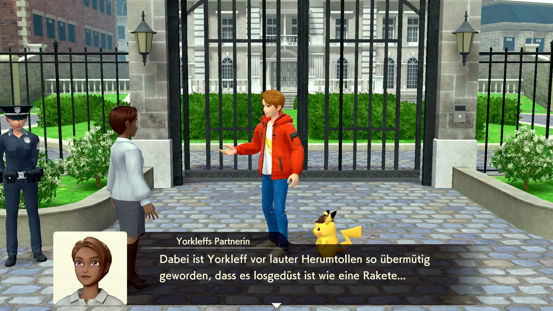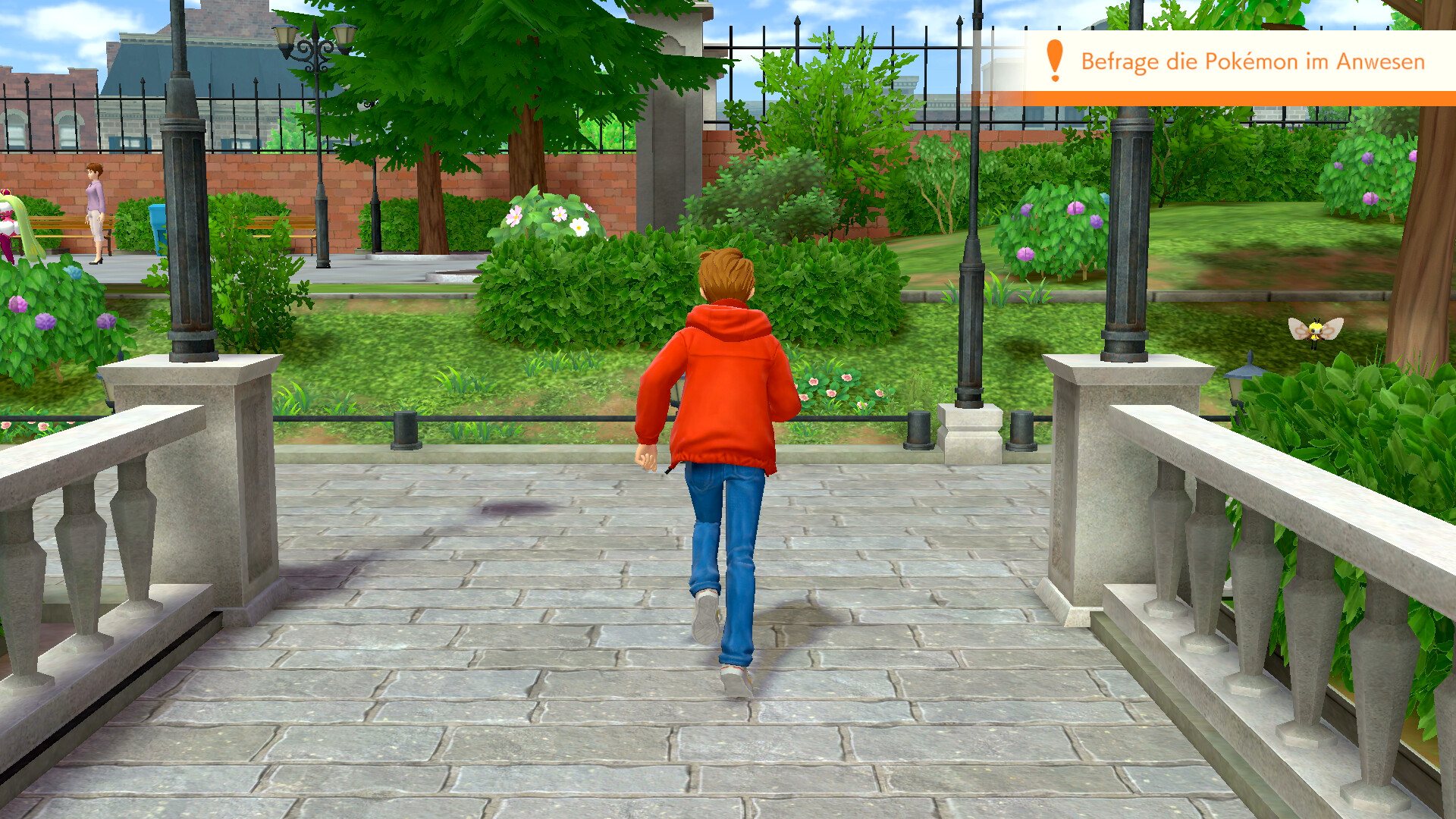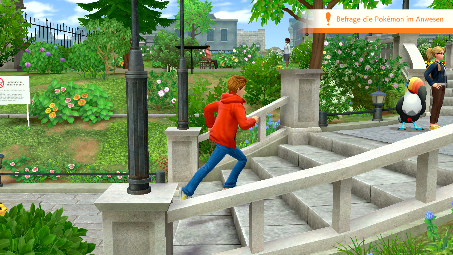 Redet nun zunächst mit den Elfun rechts vom Eingang zu dem Anwesen, um weitere Hinweise einzusammeln. Sie sprechen von einem Gladiantri, das als ein rotes Pokémon erkannt werden könnte. Ihr seid nach diesem Gespräch also auf der Suche nach Piccolente und Gladiantri - und dem Yorkleff der Frau.