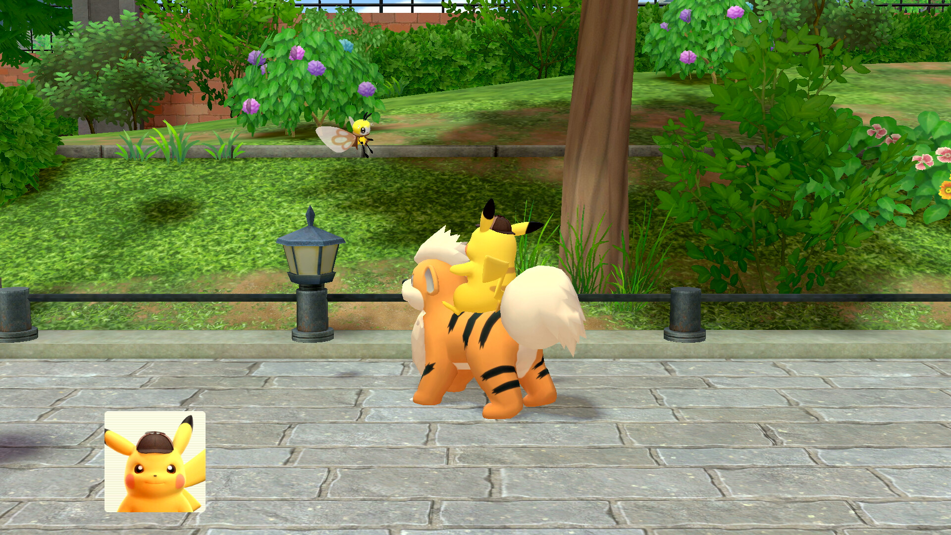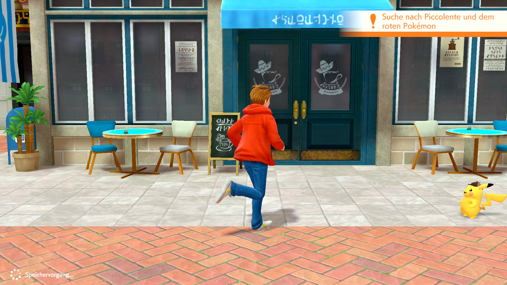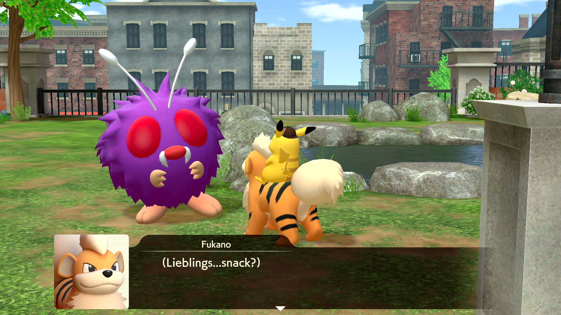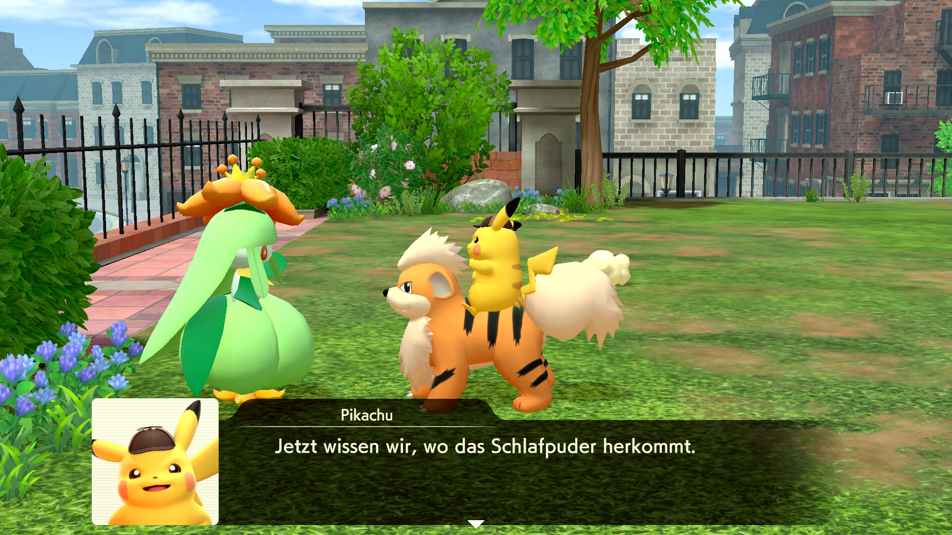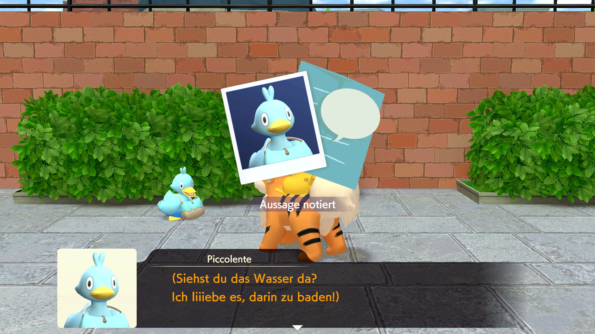 Geht also zu Fukano und fragt es um Hilfe bei der Suche nach Piccolente. Es scheint sich über die Frage sehr zu freuen. Pikachu setzt sich daraufhin direkt auf den Rücken von Fukano und ist bereit für eine Spurensuche. Geht also aus dem Zimmer und haltet die R-Taste gedrückt, um eine blaue Spur zu erkennen. Folgt der Spur aus dem Anwesen hinaus in Richtung des Parks. Dort versteckt sich Piccolente in einem Gebüsch und stellt sich euch vor. Ihr könnt nun mit dem Pokémon sprechen und findet nicht nur einen neuen Hinweis, sondern erhaltet auch die Information, dass Turner ein Urgl als Partner hat. Erzählt hat er davon aber nie.