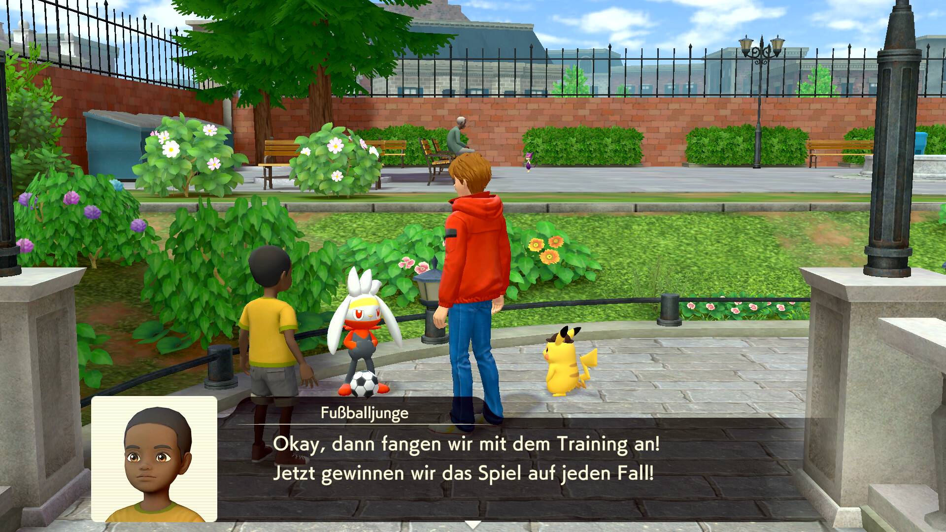Geht zurück nach links zum Fountain Plaza und redet dort mit dem Jungen im gelben Hemd, der im Norden des großen Platzes steht. Er bittet euch um Hilfe, da er einen Trainingspartner sucht, um besser zu werden. Notiert euch also auch seine Bitte nach einem Pokémon zu suchen, das gut Fußball spielen kann.