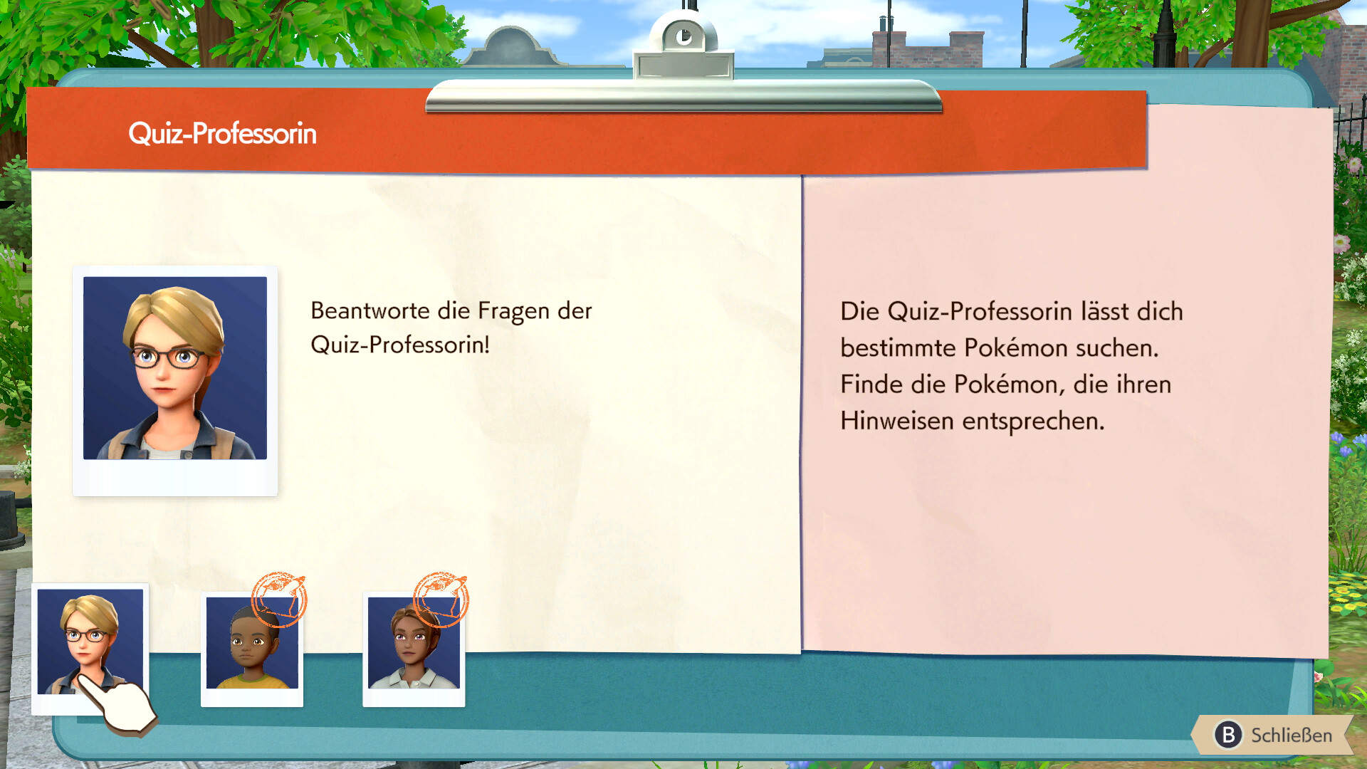 Sie fragt euch, welches Pokémon die Beute mit einer langen Zunge fängt. Die Antwort ist also Schlurp. Geht zu dem Schlurp weiter unten im Park und sprecht es an und lauft dann zurück zu der Professorin. Sie will als nächstes von einem Pokémon erfahren, das niedlich aussieht und das Aussehen zum Ablenken nutzt, um Leute zu bestehlen.