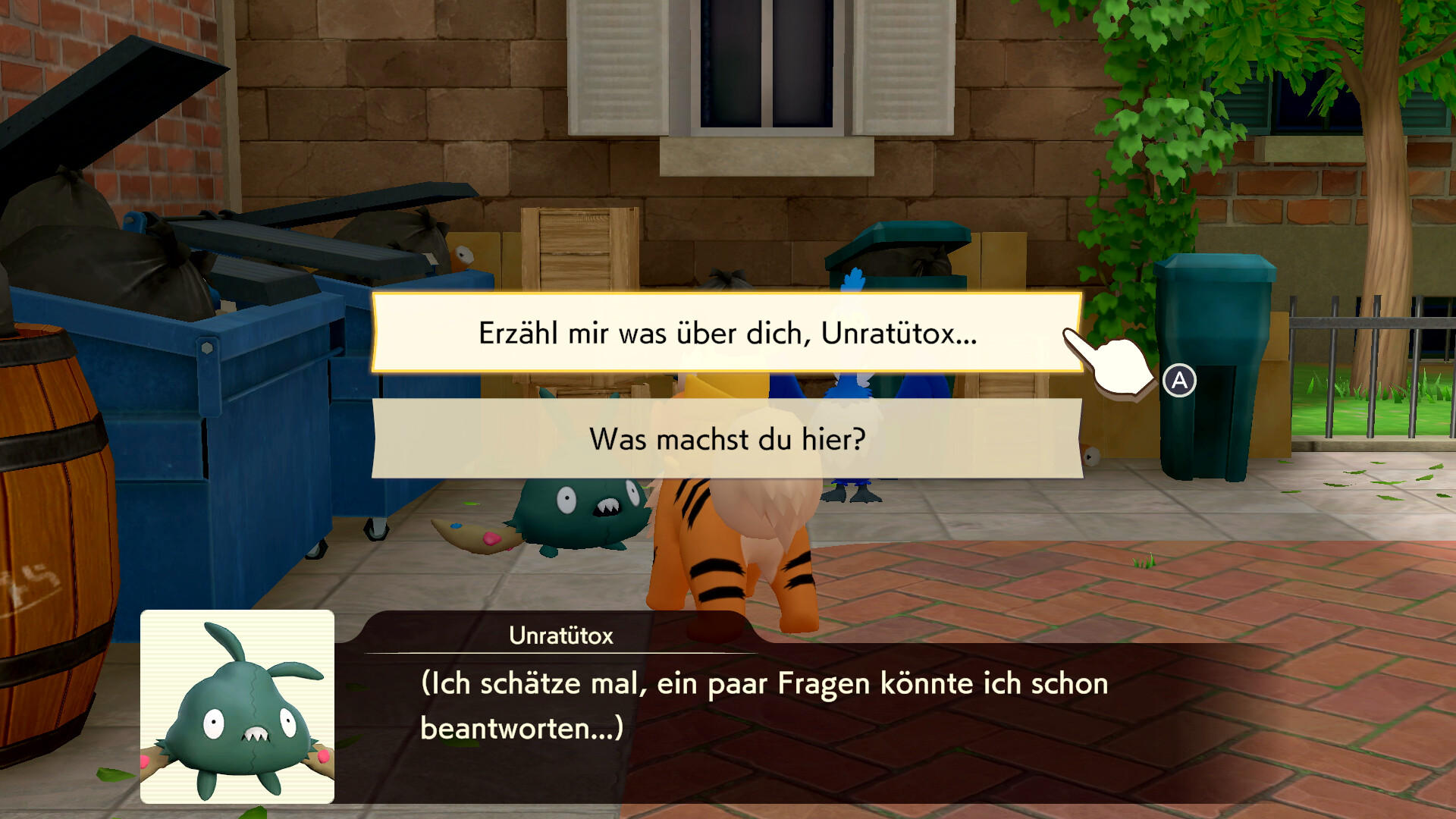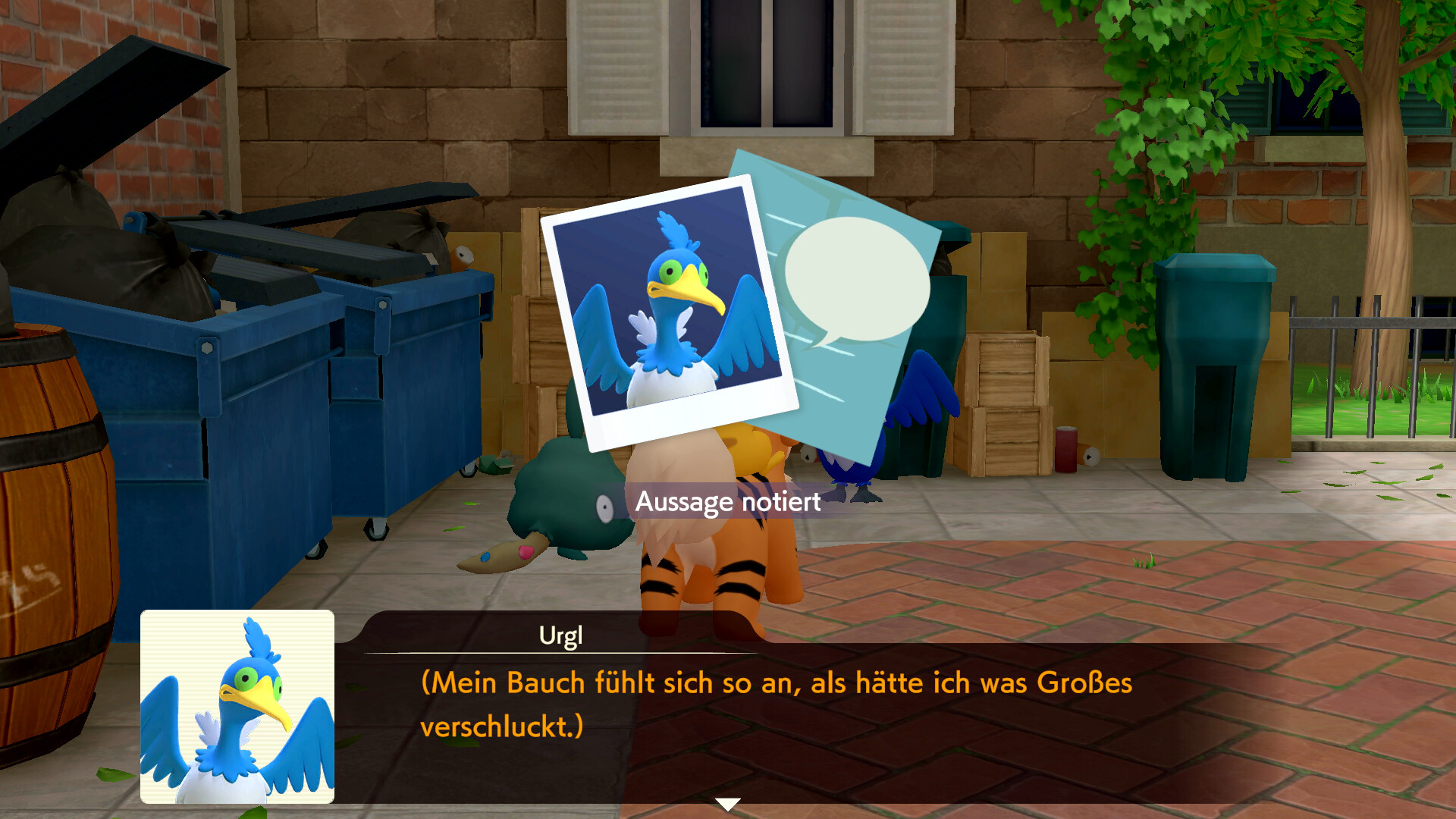 Geht nun zum Eingang des Anwesens zurück und verfolgt von dort aus die Fährte von Urgl nach links. Die Spur führt in die Seitengasse, in der wir zuvor waren. Geht dort also entlang und trefft dort auf ein schlafendes Urgl und ein Unratütox, das neben dem Pokémon steht. Urgl wacht schließlich auf und kann in ein Gespräch verwickelt werden. Es erzählt, dass es nach dem Frühstück sehr müde geworden ist, aber nicht weiß, was es gegessen haben könnte. Auch Unratütox kann angesprochen werden. Es gibt euch auch einen Hinweis zu einer Notiz einer unbekannten Person.