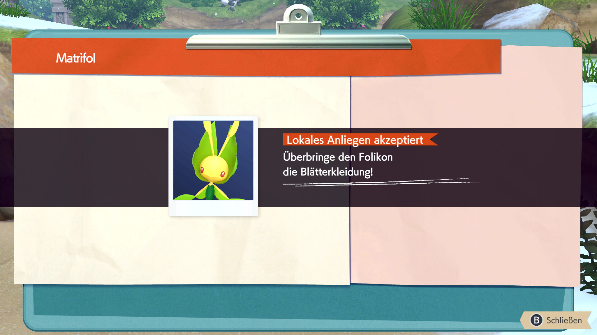 Geht nun aus dem Raum hinaus und in die mittlere Haupthalle der Ruinen. Dort findet ihr ein gelbes Taschentuch auf dem Boden das offenbar dem Professor gehört hat. Schaut euch nach eurem Fund die Quartermak-Statuen genauer an und die Fußabdrücke, die neben den Statuen sind. Rechts von den Statuen ist außerdem das zweite Folikon, das ihr für Matrifol gesucht habt. Redet mit dem Pokémon und bringt es nach Hause. Ihr habt die Option direkt zu Matrifol zu gehen, um die Nebenaufgabe abzuschließen. Nutzt diese Gelegenheit, um mit Matrifol zu sprechen und die Aufgabe erfolgreich abzuschließen.
