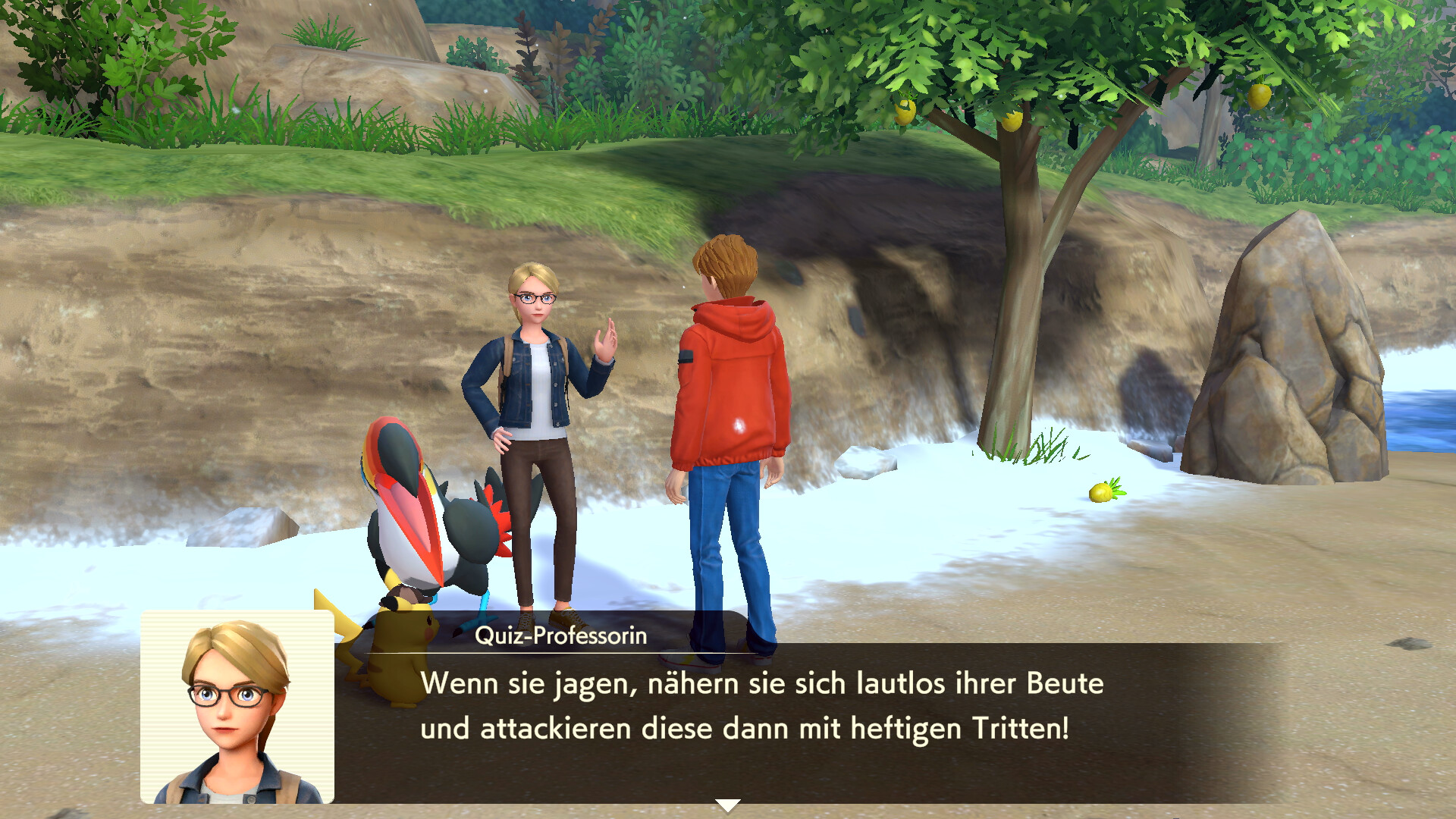 Lauft ihr von Ursaring gesehen aus nach rechts, so trefft ihr schließlich auf die Quiz-Professorin. Sie stellt euch erneut drei Fragen und will nacheinander Bauz, Akkup und Cottomi sehen. Bauz und Akkup findet ihr zu Beginn des Gebiets, während ihr Cottomi links von den Ruinen finden könnt.