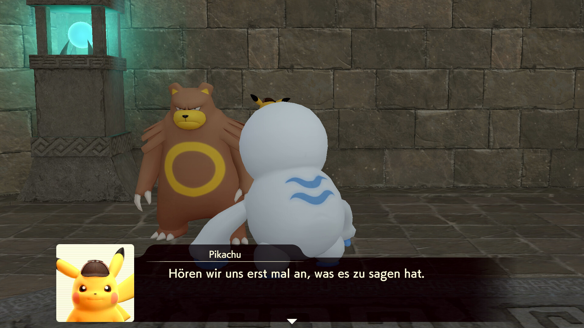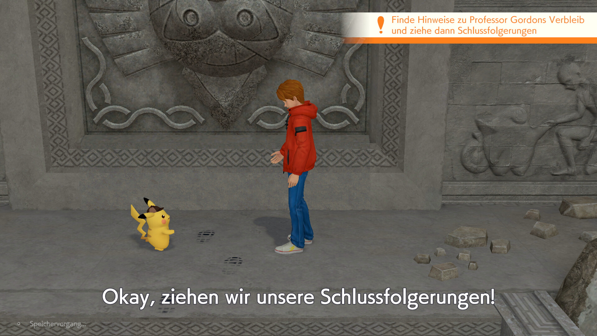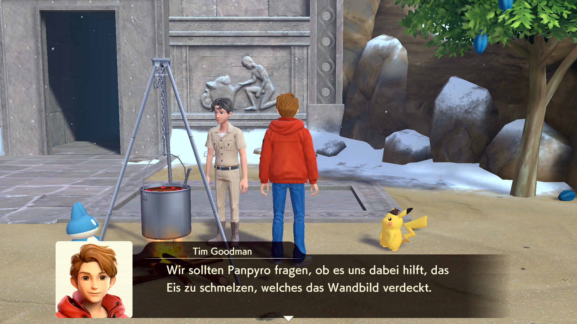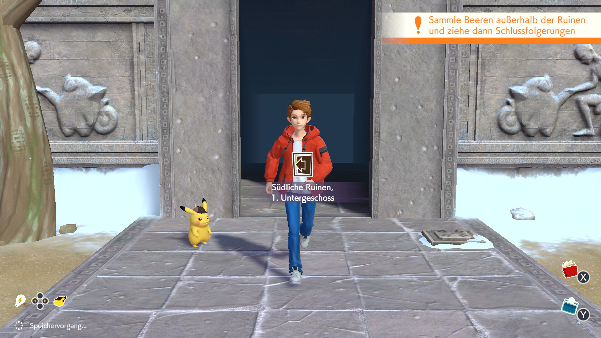 Geht nun zum Eingang der Ruine und untersucht diesen. Untersucht den mittleren Teil der Tür und die Platte rechts der Tür, um alle wichtigen Hinweise zu sammeln. Mit den Informationen könnt ihr jedoch noch keine Schlussfolgerung ziehen, weshalb ihr zunächst mit Mampfaxo reden solltet und dann mit Quartermak, welches sich im Baum befindet, der über den linken Weg von der Ruine erreicht werden kann. Daraufhin findet ihr mit Pikachu gemeinsam einen neuen Knopf auf der oberen Seite des Eingangstors. Mit diesen Informationen könnt ihr die erste Schlussfolgerung ziehen: