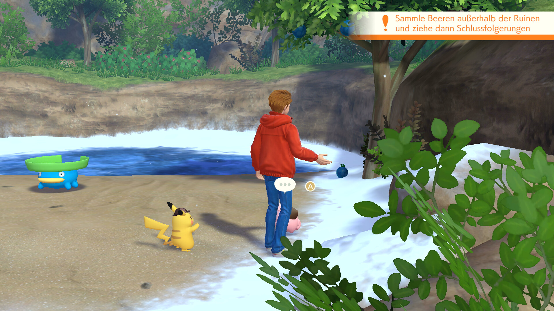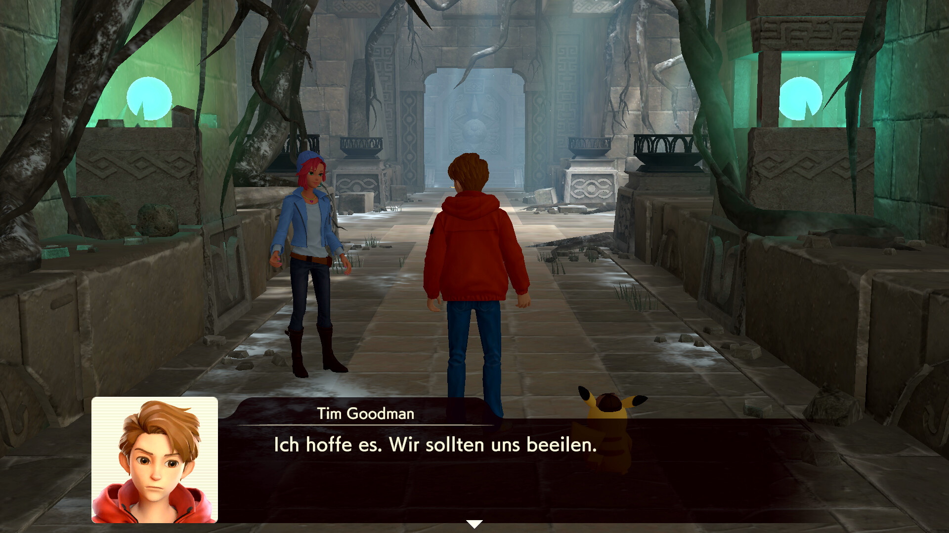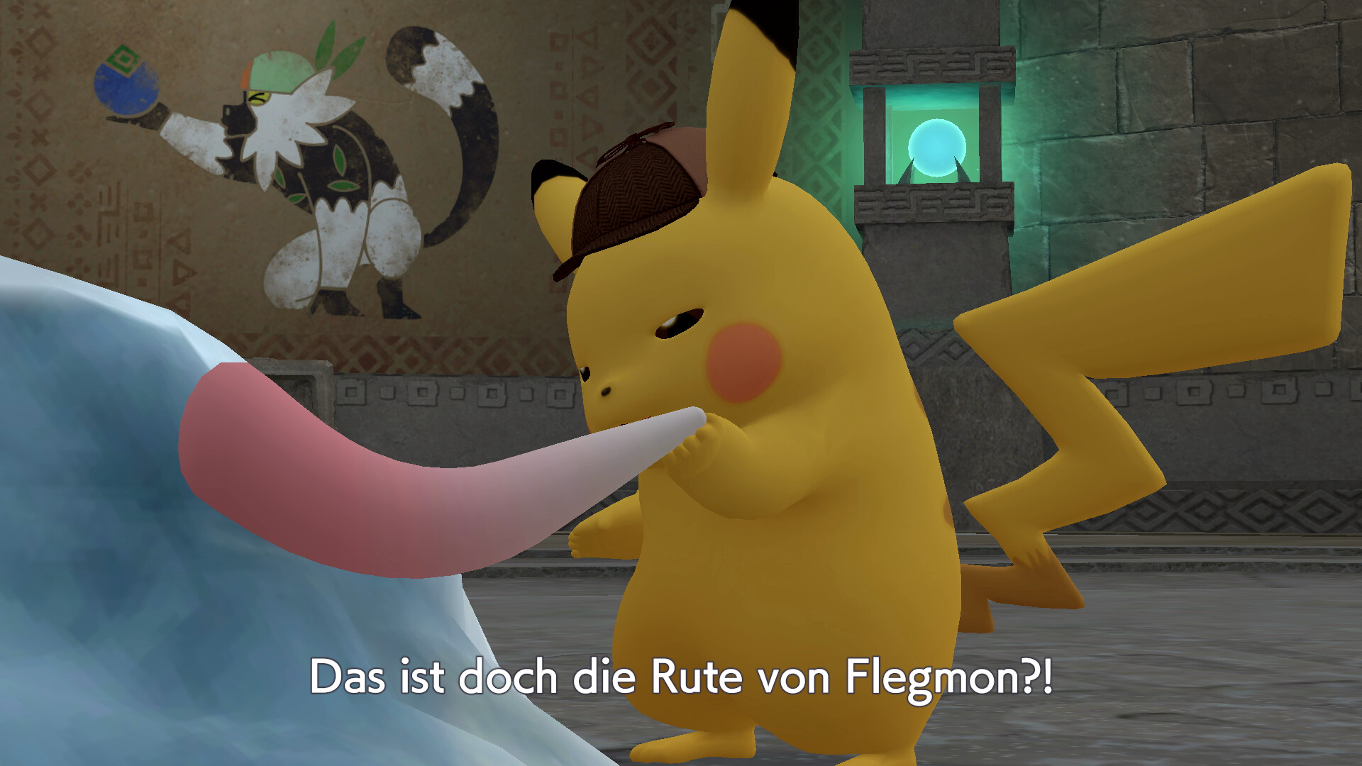 Geht nun zum Eingang der Ruine und untersucht diesen. Untersucht den mittleren Teil der Tür und die Platte rechts der Tür, um alle wichtigen Hinweise zu sammeln. Mit den Informationen könnt ihr jedoch noch keine Schlussfolgerung ziehen, weshalb ihr zunächst mit Mampfaxo reden solltet und dann mit Quartermak, welches sich im Baum befindet, der über den linken Weg von der Ruine erreicht werden kann. Daraufhin findet ihr mit Pikachu gemeinsam einen neuen Knopf auf der oberen Seite des Eingangstors. Mit diesen Informationen könnt ihr die erste Schlussfolgerung ziehen: