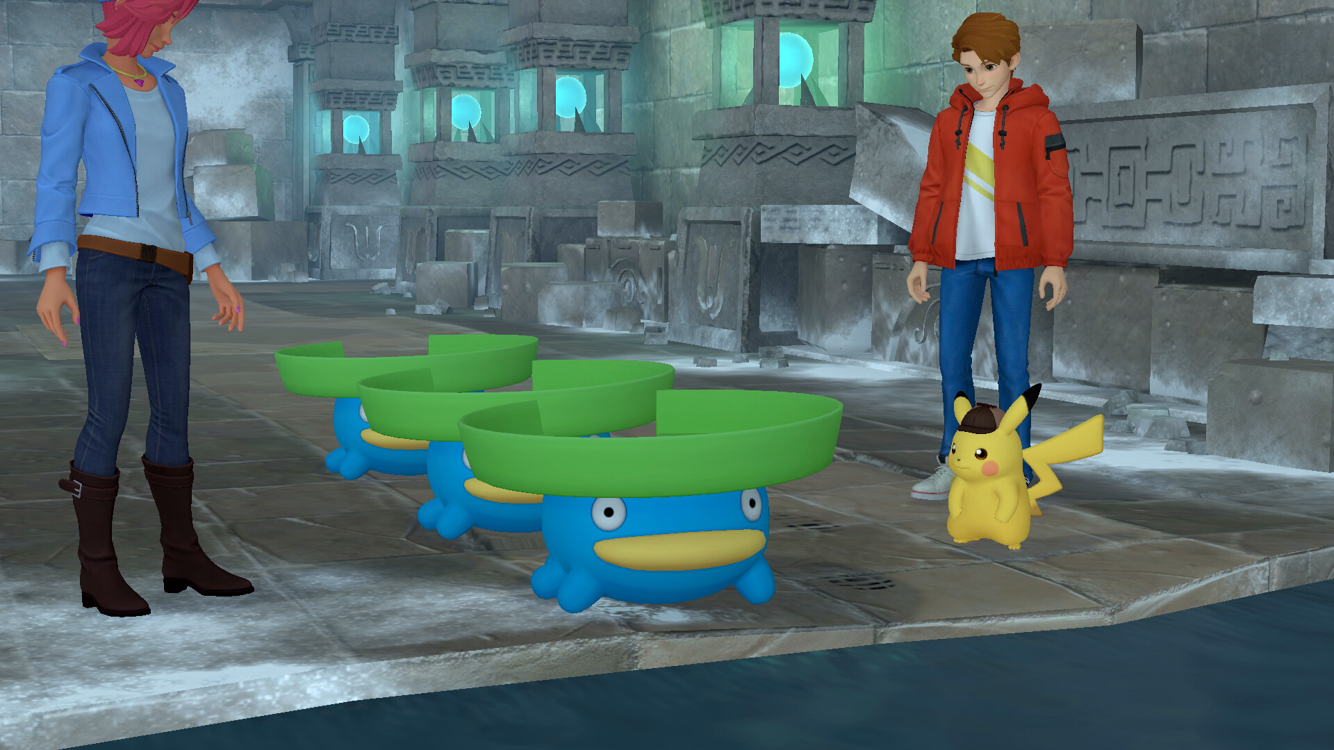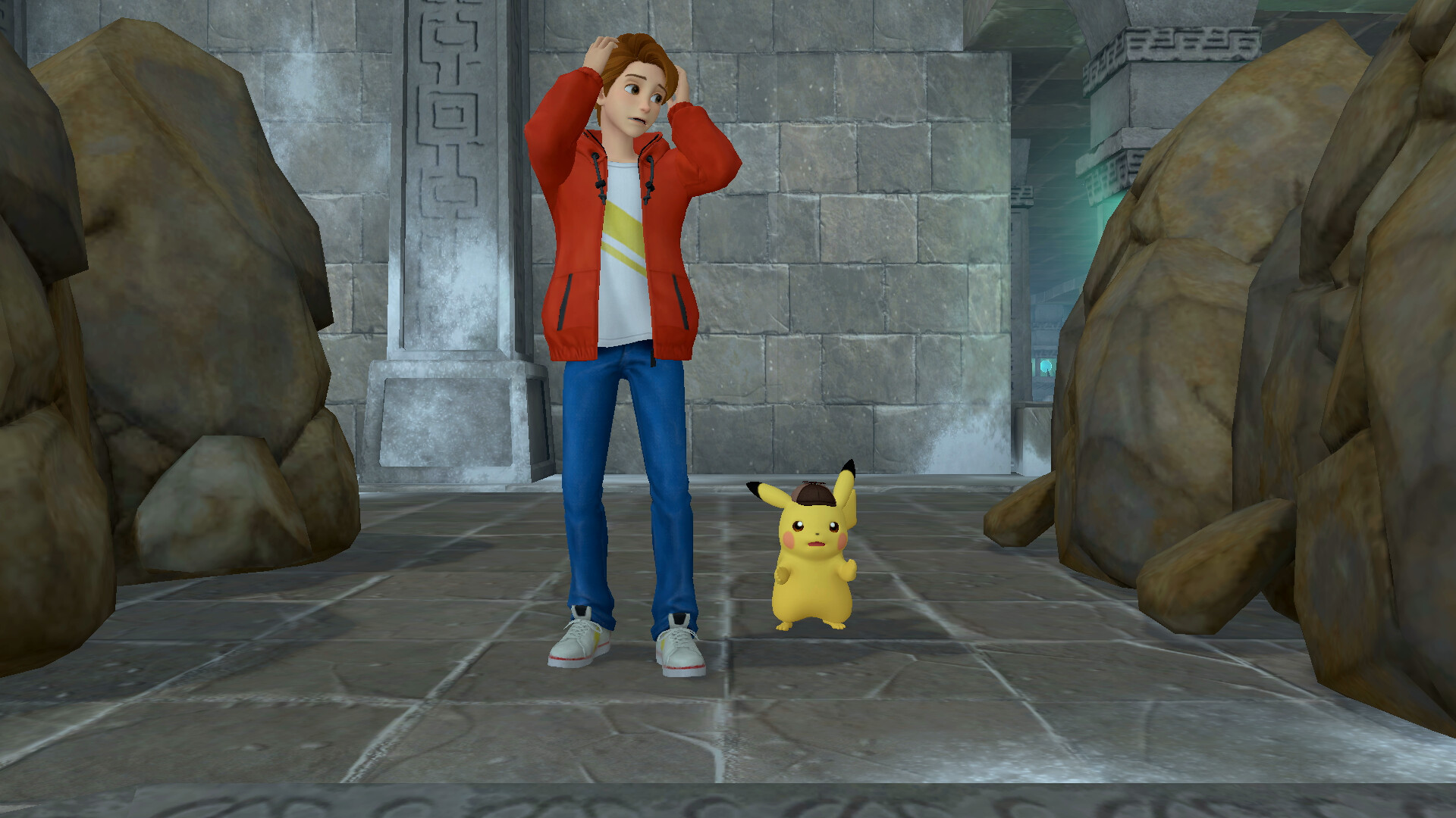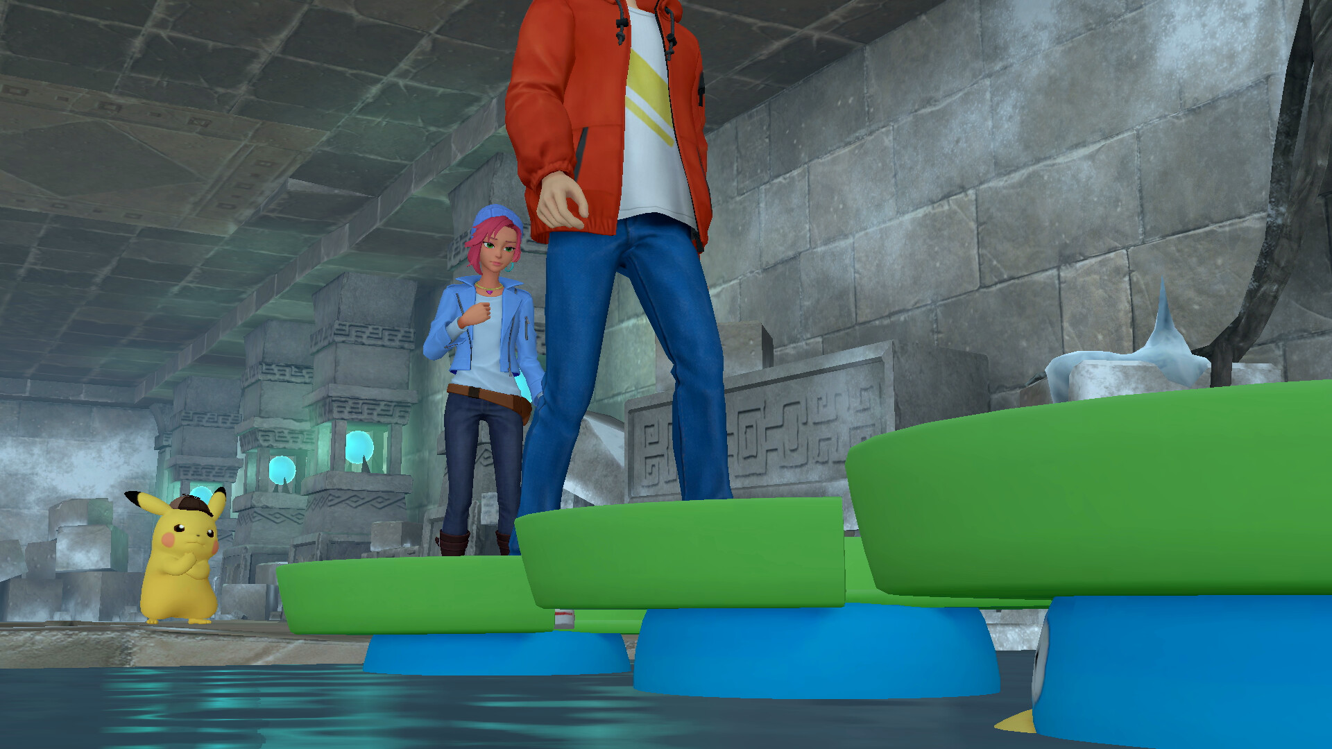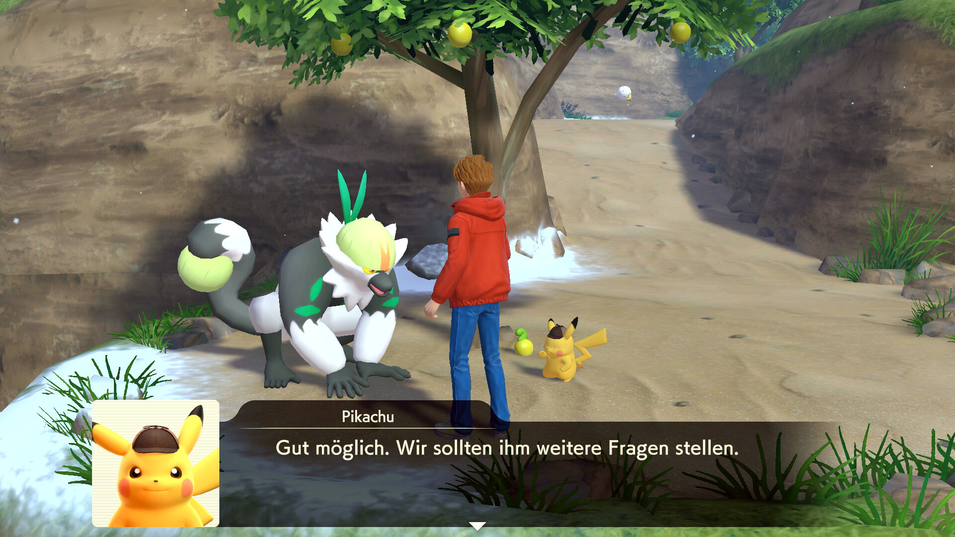 Geht nun zum Eingang der Ruine und untersucht diesen. Untersucht den mittleren Teil der Tür und die Platte rechts der Tür, um alle wichtigen Hinweise zu sammeln. Mit den Informationen könnt ihr jedoch noch keine Schlussfolgerung ziehen, weshalb ihr zunächst mit Mampfaxo reden solltet und dann mit Quartermak, welches sich im Baum befindet, der über den linken Weg von der Ruine erreicht werden kann. Daraufhin findet ihr mit Pikachu gemeinsam einen neuen Knopf auf der oberen Seite des Eingangstors. Mit diesen Informationen könnt ihr die erste Schlussfolgerung ziehen: