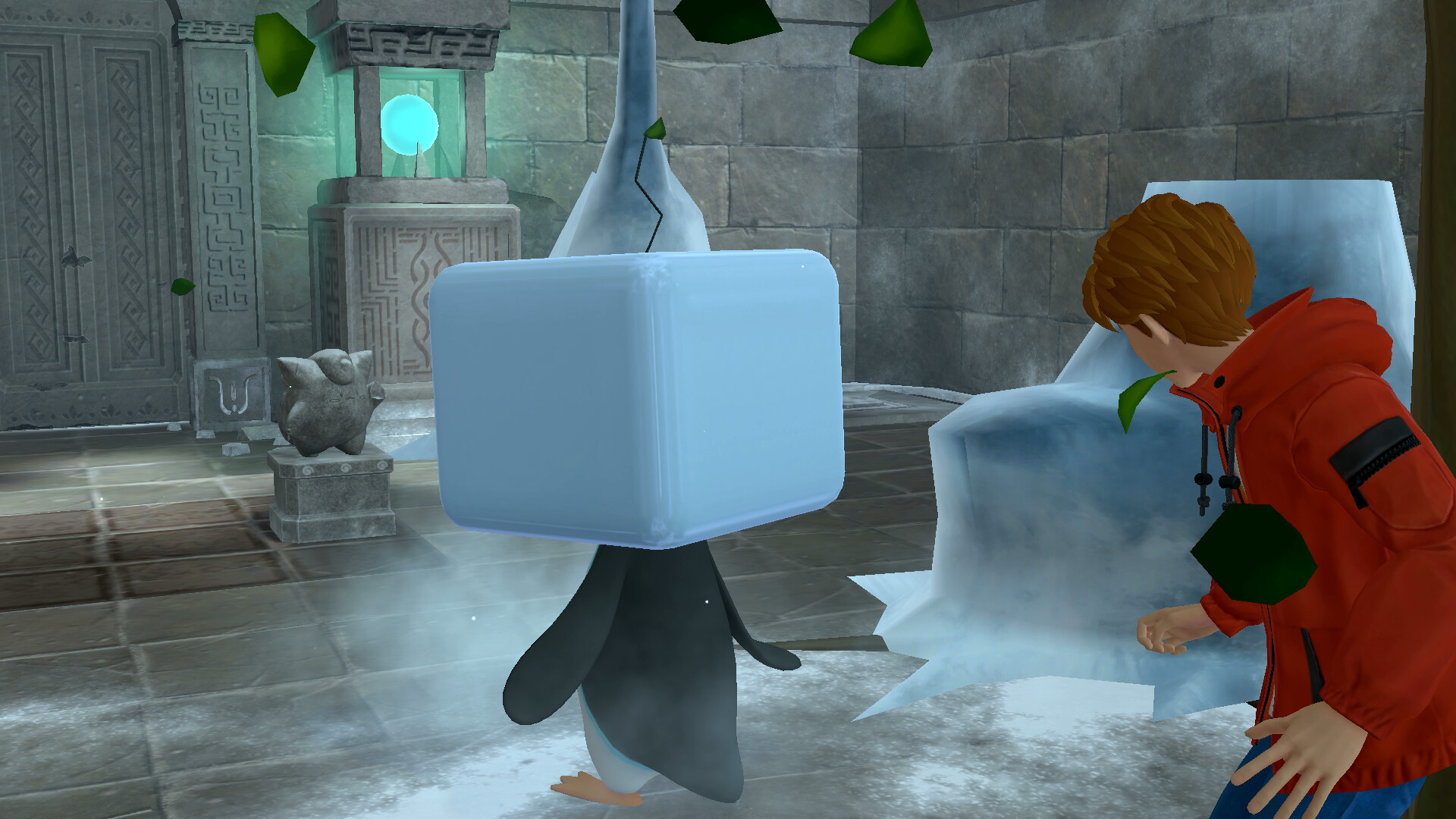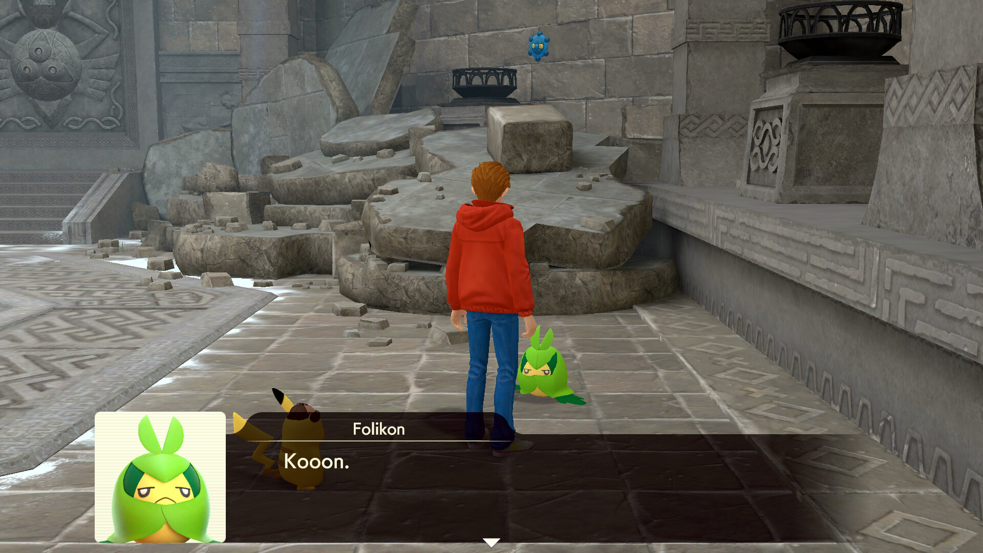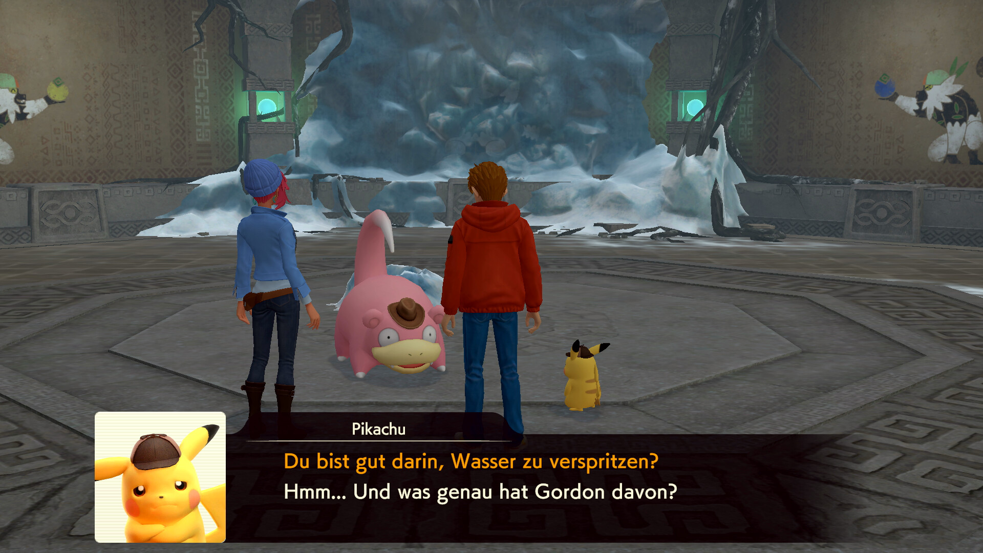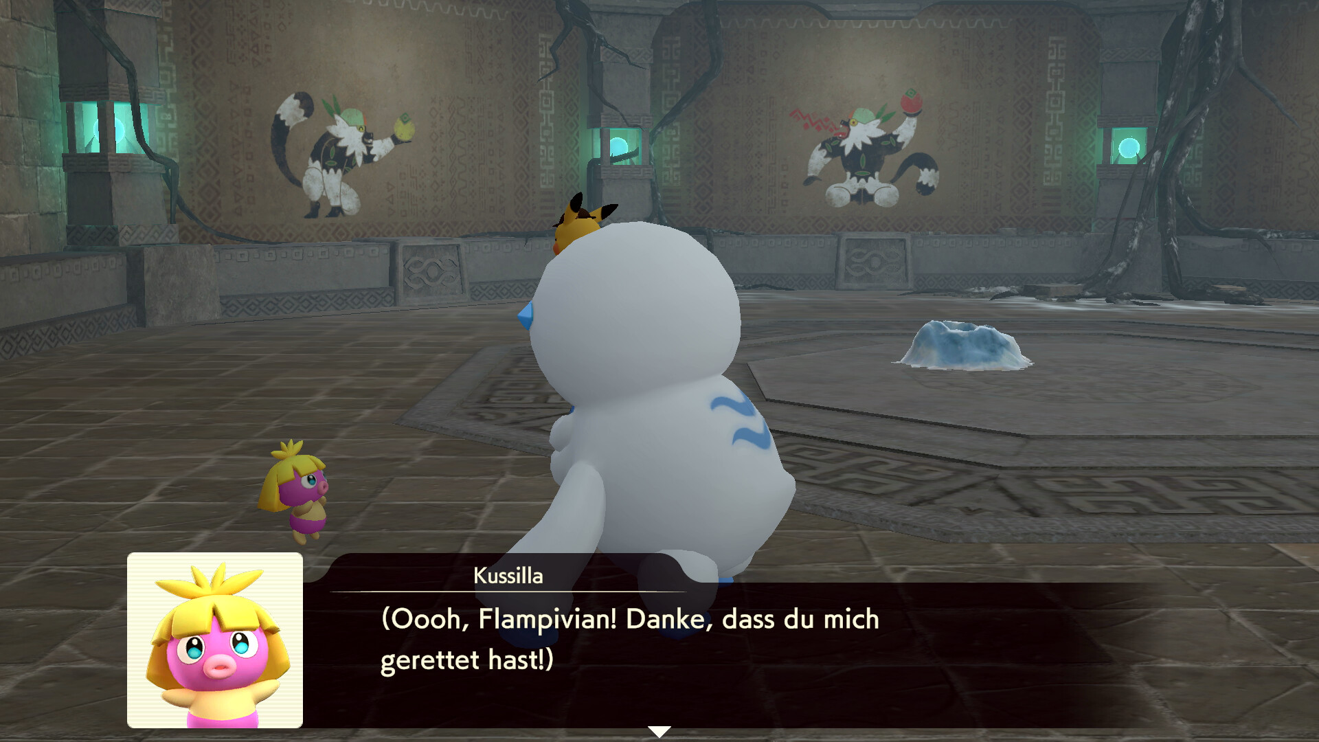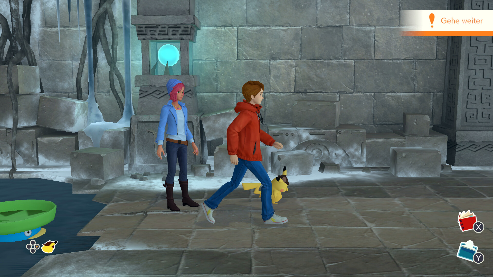 Nun könnt ihr mit Professor Gordon darüber sprechen, wie er in den Ruinen eingeschlossen wurde und auch über das Juwel mehr erfahren. Nach dem Gespräch bittet euch Galar-Flampivian um Hilfe, da es seine Pokémon-Freunde sucht. Pikachu setzt sich also wieder auf den Kopf und kann erneut mit Galar-Flampivian umherlaufen. Geht also aus dem Raum hinaus und dann nach links, um erst die Loturzel zu verabschieden und dann den Weg zu vereisen, sodass darüber gelaufen werden kann. Geht dann ein Stockwerk nach oben und quer durch die Haupthalle. Lauft dann nach rechts zu der Eiswand und zerschlagt sie.