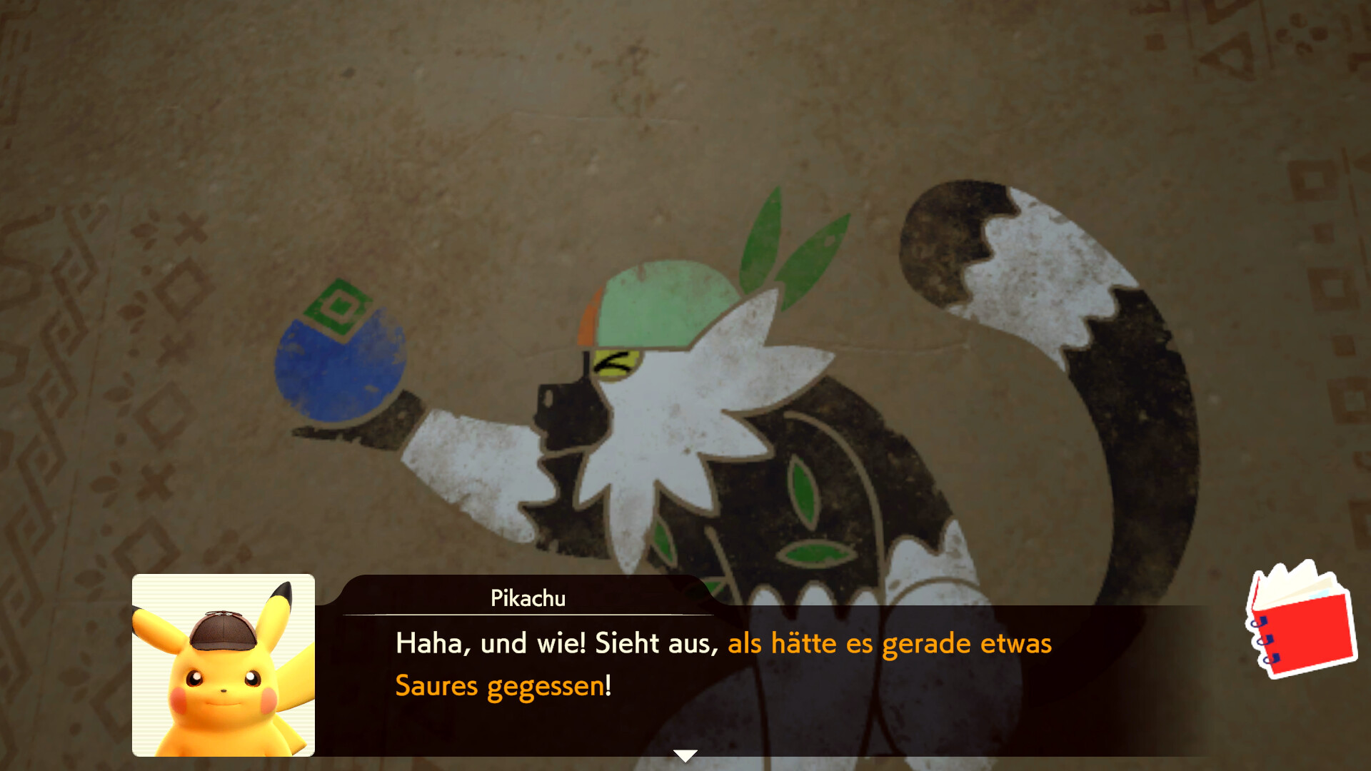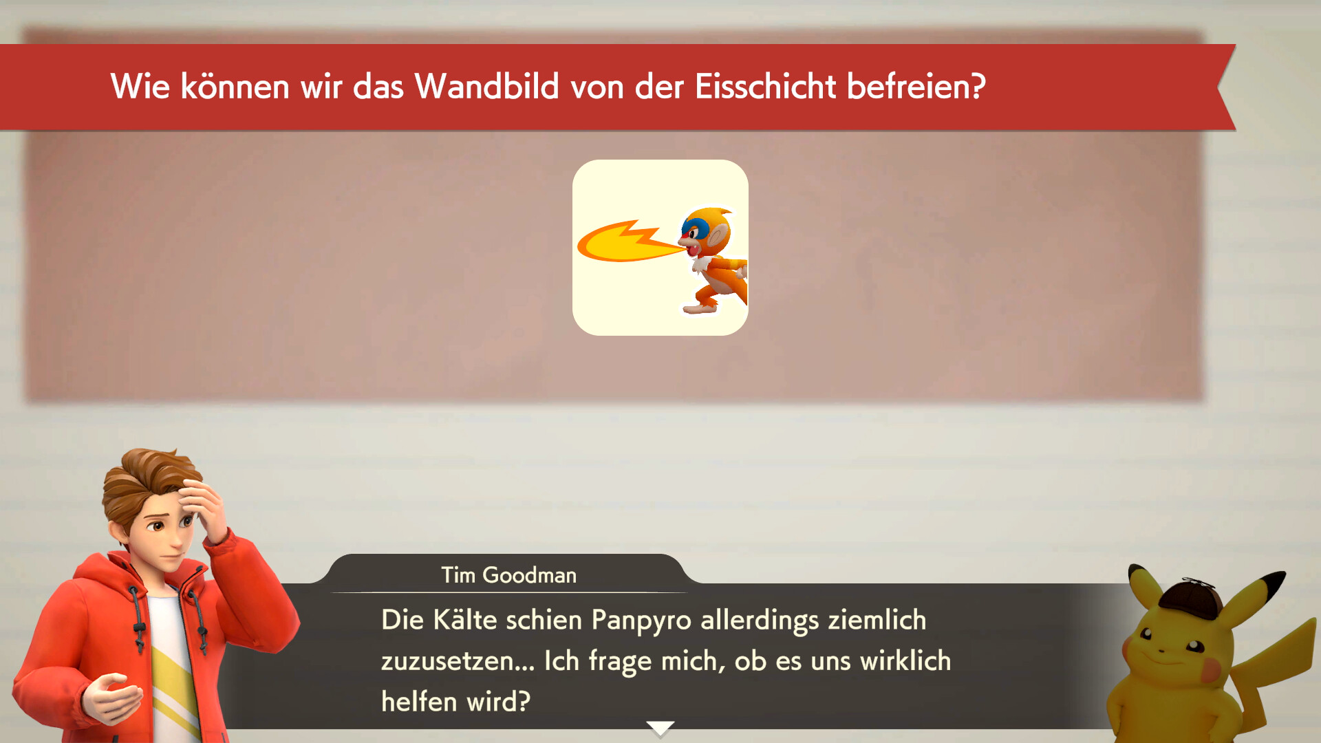 Ihr geht nun also zu Panpyro, um nach Hilfe zu fragen. Es ist bereit mit seinem Feuer das Eis an der Wand in der Ruine zu schmelzen und legt ein drittes Wandbild frei. Untersucht auch bei diesem Wandbild den Gesichtsausdruck und die Beere des Pokémon. Mit den bereits gesammelten Informationen von draußen, könnt ihr direkt eine Schlussfolgerung auf die nun neu gestellte Frage ziehen: