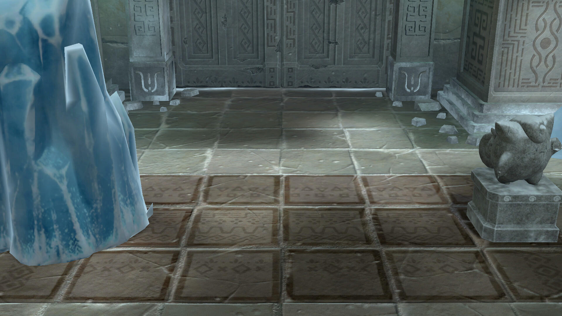 Ihr setzt eure Lösung nun in die Tat um und schafft es die Ruinen zu öffnen. Geht in die Ruinen hinein und dann nach links, um Professor Gordons Flegmon zu finden. Nachdem es aus dem Eis befreit wurde, könnt ihr mit dem Pokémon reden und es gibt euch ein paar Hinweise darauf, wo der Professor sein könnte. Ihr beschließt also die Wandbilder der Ruinen genauer anzuschauen. Geht also zu dem Wandbild hinter Flegmon und wählt das Eis aus, das dort an der Wand ist, um einen Hinweis zu erhalten.