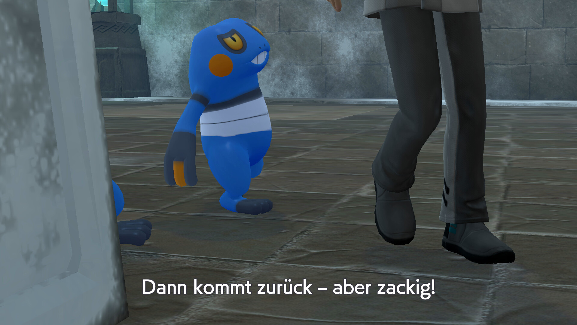 Nachdem ihr das Rätsel gelöst habt, öffnet sich der Ausgang aus der Ruine. Doch bevor ihr sie verlassen könnt, taucht hinter euch auf einmal eine Person in unbekannten Klamotten auf. Er scheint mit seinem Boss zu telefonieren, der nicht sehr erfreut zu sein scheint. Als er Pikachu entdeckt, will er es schließlich schnappen, jedoch rennt er schnell davon, nachdem er auch Galar-Flampivian, Kubuin und Flegmon neben Pikachu entdeckt hat. Pikachu und Galar-Flampivian verfolgen die unbekannte Person daraufhin, werden jedoch von einem Mamutel aufgehalten, welches von dem Unbekannten gerufen wird. Das Mamutel hat, wie auch Urgl, eine leuchtende Box auf dem Rücken und schafft es die Verfolgungsjagd zu unterbrechen, obwohl es von Galar-Flampivian hart getroffen wurde.