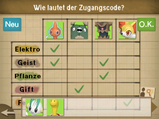 Geht zum Eingabefeld des Zugangscodes im Flur und schaut ihn euch genauer an. Wählt dann Ermitteln aus und löst das Rätsel der Pokémontabelle.