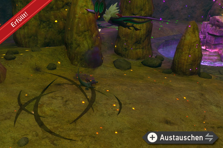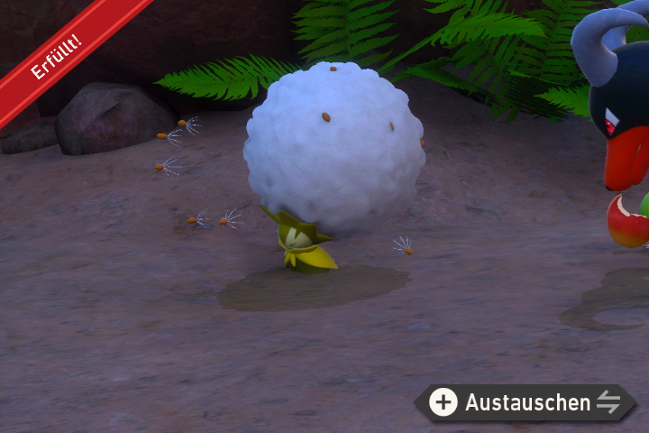 - Fahrt den Weg bis zu dem Platz entlang auf dem sich einige Cottomi befinden. Werft einen Samtapfel links oben auf den Felsen, damit ein Natu erscheint. Lockt das Natu zu einem Cottomi in der Nähe. Wenn Natu dem Pokémon zu nahe kommt setzt es seine Sporen frei. Macht davon ein Foto.
