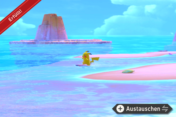- Lockt Pikachu vom zweiten Strand zu der kleinen Sandbank auf der ein Flunschlik liegt. Das Pikachu wird auf dem Flunschlik surfen.