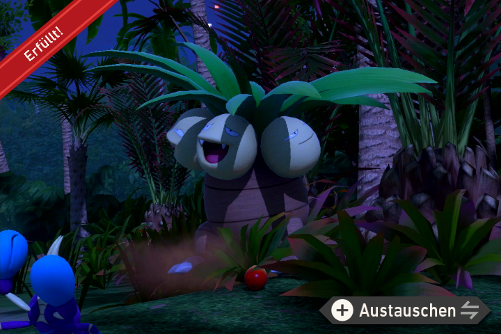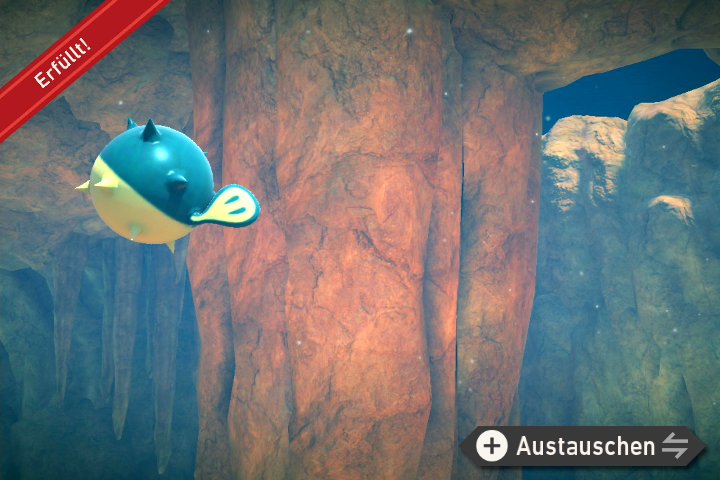 - Bewerft ein Baldorfish auf Level 1 mit einem Samtapfel, sodass es sich aufpustet. Werft dann einen weiteren Samtapfel auf das Pokémon, damit es wieder normale Form annimmt und dabei umherschwimmt. Macht ein Foto während es durch die Gegend fliegt.