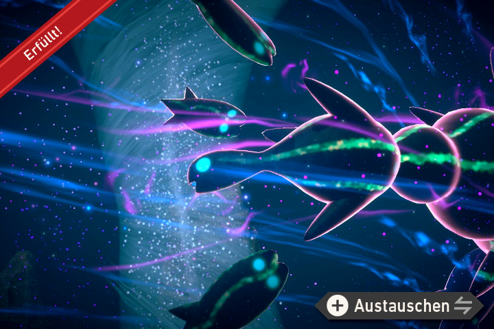 - Werft so viele Lusardin wie möglich mit einer Lumina-Kugel ab, damit diese zu einem Lusardin in Schwarmform werden. Bewerft das Pokémon dann mit Lumina-Kugeln, damit es leuchtet und schließlich einen Strudel erzeugt. Macht davon ein Foto.
