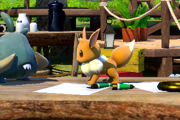 - Basiscamp: Startet vom Camp-Eingang aus und fahrt in das Labor. Dort schlafen Bissbark und Evoli auf dem Boden. Bewerft beide mit Lumina-Kugeln und führt einen Scan durch, um sie zu wecken. Scannt anschließend noch einmal in der Nähe des großen Fernsehbildschirmes, um drei Wommel erscheinen zu lassen. Die Wommel müsst ihr mit einigen Lumina-Kugeln bewerfen, damit sie mit Evoli spielen. Werft während und kurz nach dem Spielen mit den Wommel eine Lumina-Kugel auf Evoli, damit es leuchtet und sich hinsetzt.