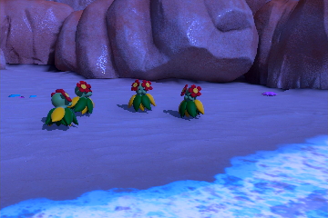 - Rosa Strand - Strand (Tag): Kurz bevor Kokowei den Weg blockiert verstecken sich mehrere Blubella im Gebüsch hinter der Kristallblume. Lockt sie hervor indem ihr Lumina-Kugeln auf die Kristallblume werft und spielt Musik, damit sie beginnen zu tanzen.