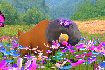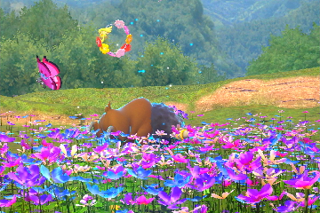 - Floreo-Naturpark - Park (Tag): Werft eine Lumina-Kugel auf Bisofank und macht ein Foto von dem Bisofank in der Blumenwiese, welches einen Blumenkranz auf dem Kopf hat.
