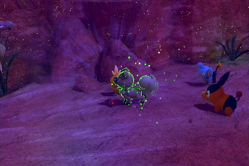 - Trockenes Ödland (Nacht): Werft auf Stufe 3 eine Lumina-Kugel auf die Digda, die am Start des Gebiets im Boden sind und macht ein Foto von ihnen, wenn sie daraufhin auftauchen. Macht dies mit 5 Digdas und wartet bis sie sich vor der Kristallblume bei dem runden Felsen versammeln. Werft dann eine Lumina-Kugel auf die Blume und nehmt den Alternativweg, der so frei wird. Fahrt den Weg entlang bis Wuffels und seine Freunde schlafend auf einem Vorsprung liegen. Weckt Wuffels so schnell ihr könnt mit einem Apfel auf und werft dann eine Lumina-Kugel auf das Pokémon, damit es eine Attacke einsetzt, sobald ein ungebetener Gast vorbei schaut. Macht ein Foto davon.