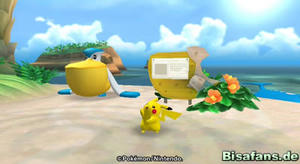Oben rechts, bei der roten Markierung auf der Minikarte, ist ein Drifzepeli-Halt. Unten rechts, bei der blauen Markierung ist Wailord, der uns momentan noch nicht weiterhelfen kann. Weiter geht es nur über die Brücke im linken Bereich der Minikarte, wo wir von Corasonn direkt angesprochen werden. Es fordert uns zu einem Ratespiel auf. Natürlich nehmen wir an ;) Die Fragen sind leider zufällig, doch nicht sonderlich schwer. Bei mir wurde z.B. gefragt, welche Farbe Pikachus Rückenstreifen haben (Braun) und wie viele es hat (Zwei). Tricky war nur die letzte Fragen zum Gangboss (Krabby). Du hast aber unendlich Versuche, also keine Sorge, wenn es nicht auf Anhieb klappen sollte. An dieser Stelle erfahren wir auch, dass Krebscorps und Krabby zum Strand kommen, wenn wir Flaschen sammeln und diese in den Altglascontainer werfen. Danke für die Tipps Corasonn! Es ist nun auch dein Freund
