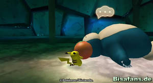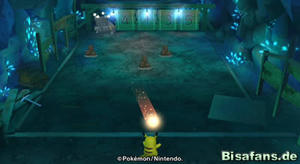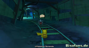 Hast du Relaxo die große Beere gebracht, gibt es eine überraschende Szene, bei der auch Phanpy und Raichu erscheinen. Wir können uns aber erst einmal aus dem Wasserbereich um Relaxo herum das Schienenstück schnappen und dieses den weiten Weg zu Pantimos im unteren rechten Teil der Minikarte tragen. Unterwegs triffst du übrigens auch auf Machomei und seine Turnübung sowie Bollterus und sein Minispiel. Ich ging aber erst einmal zu Pantimos, welches daraufhin die Schienen reparierte. Nun fehlt nur noch die Lore, die Kaumalat ja herausgeben wollte, wenn die Schienen repariert sind. Also auf zu Kaumalat (links von Plaudagei im Tunnel).