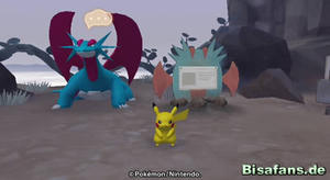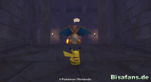 Schreite voran bis du auf Glurak triffst. Dieses wird dich hier willkommen heißen. Natürlich kannst du es auch zum Kampf fordern um es als Freund zu gewinnen. Ein Stück weiter links wartet Hoppspross, welches uns aber nur passieren lässt, wenn wir Absols Minispiel gemeistert haben. Also gehen wir rechts von Glurak (blaue Markierung auf der Minikarte) und fordern Absol heraus...