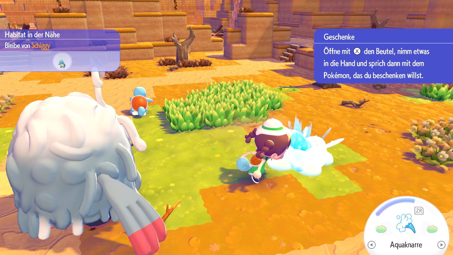 - Nach einem Treffen mit Rotomurf den Wunsch erfüllen und mit Aquaknarre den Boden bewässern.