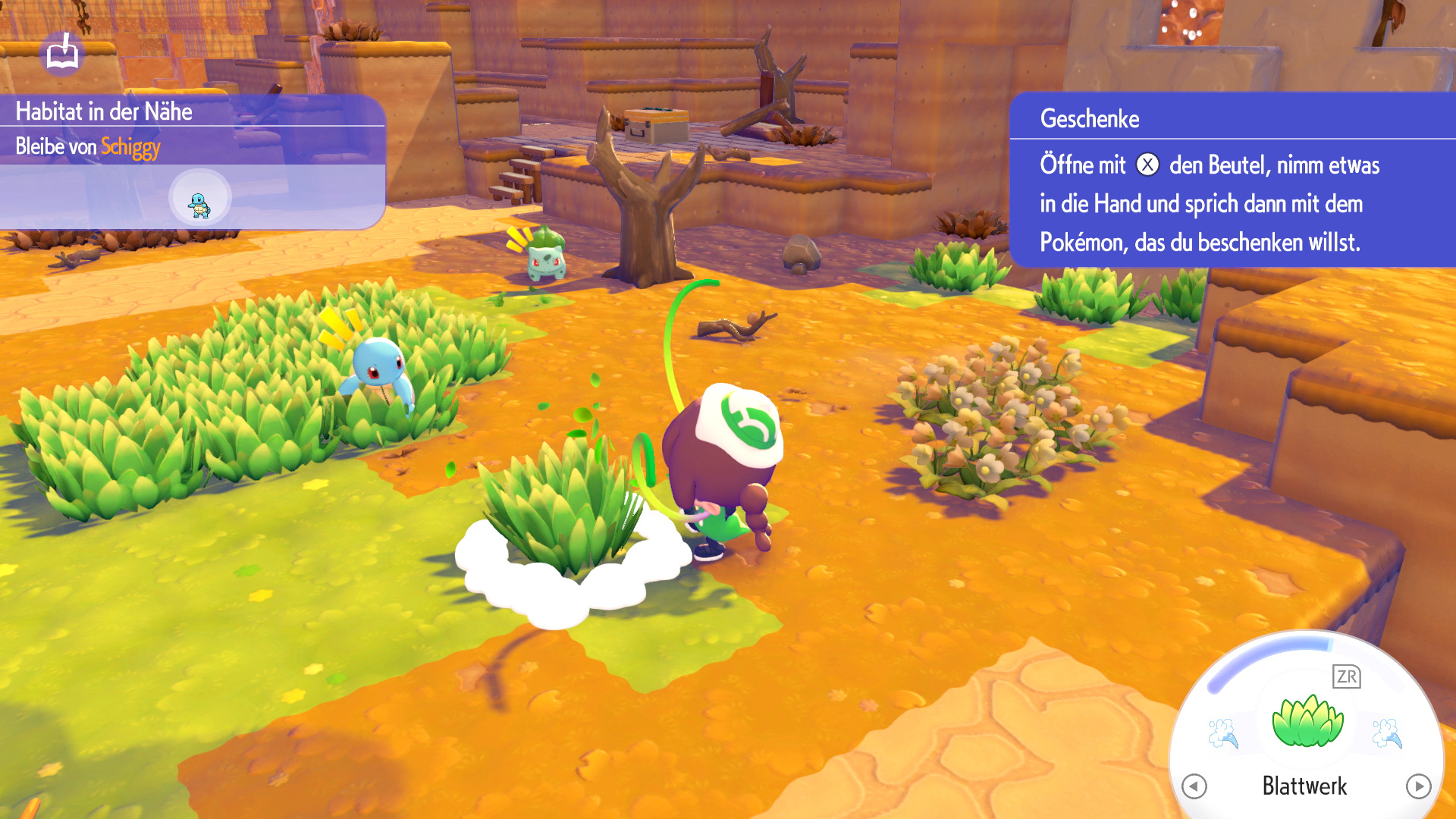 - Nach einem Treffen mit Bisasam seinen Wunsch erfüllen und 10 Grasbüschel mit Aquaknarre bewässern