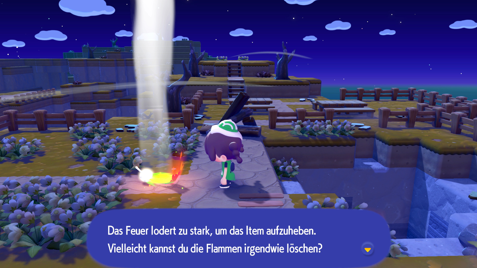 Die Buntschwinge ist von einer heißen Aura umgeben, die zunächst durch das Talent Aquaknarre gelöscht werden muss. Setzt also Aquaknarre auf die Schwinge ein, um sie anschließend aufzuheben.