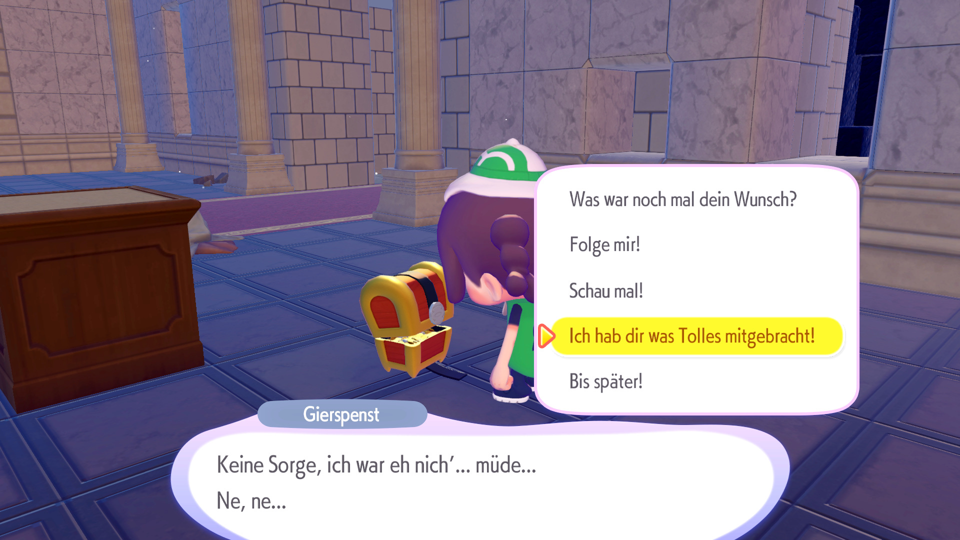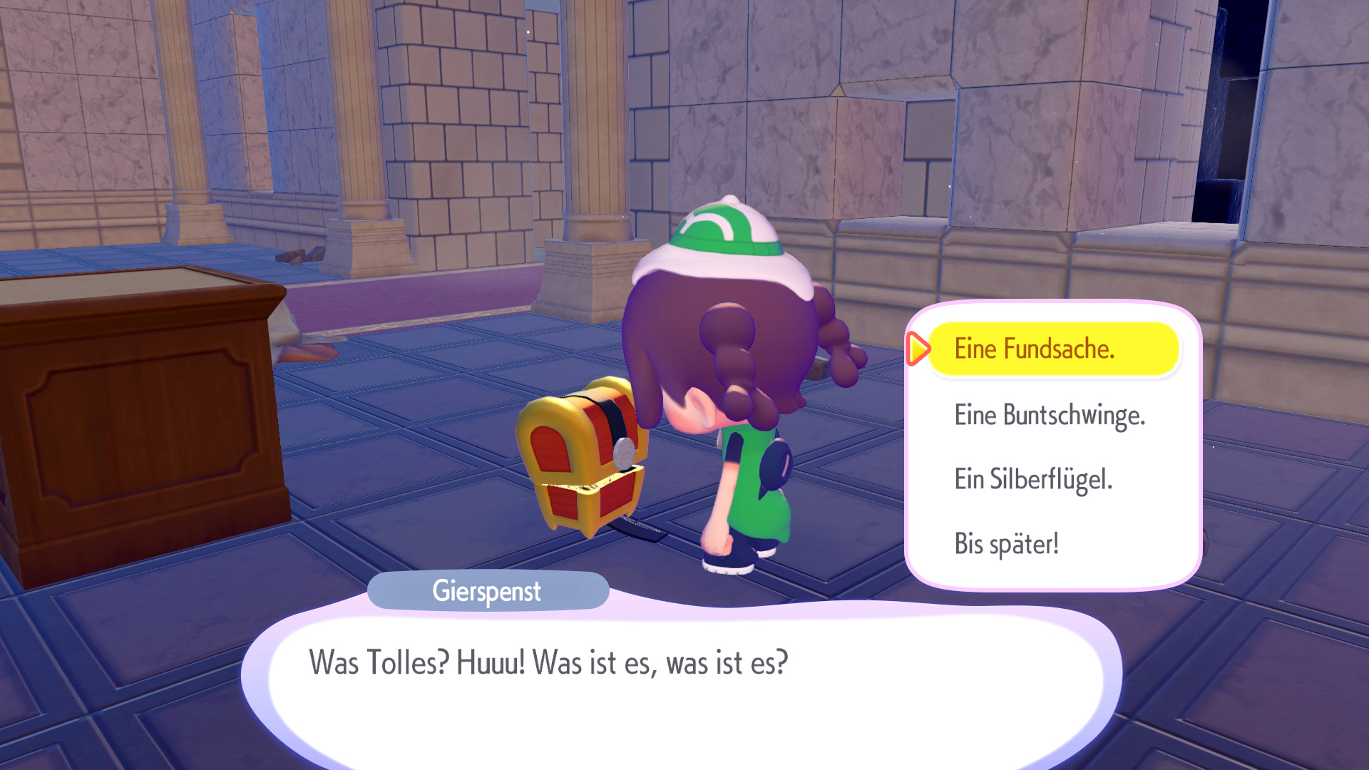 Nehmt die Items mit zu Gierspenst und sprecht es an, um mit dem Pokémon zu tauschen. Es bietet euch an Fundsachen, Buntschwingen und Silberflügel zu tauschen. Im Tausch für diese Items schenkt es euch dann verschiedenste Luxus-, Pop-Art-, oder Niedliche Möbelstücke, die ihr in euren Wohnungen aufbauen könnt. Welches Möbelstück ihr erhaltet wird zufällig ausgewählt.