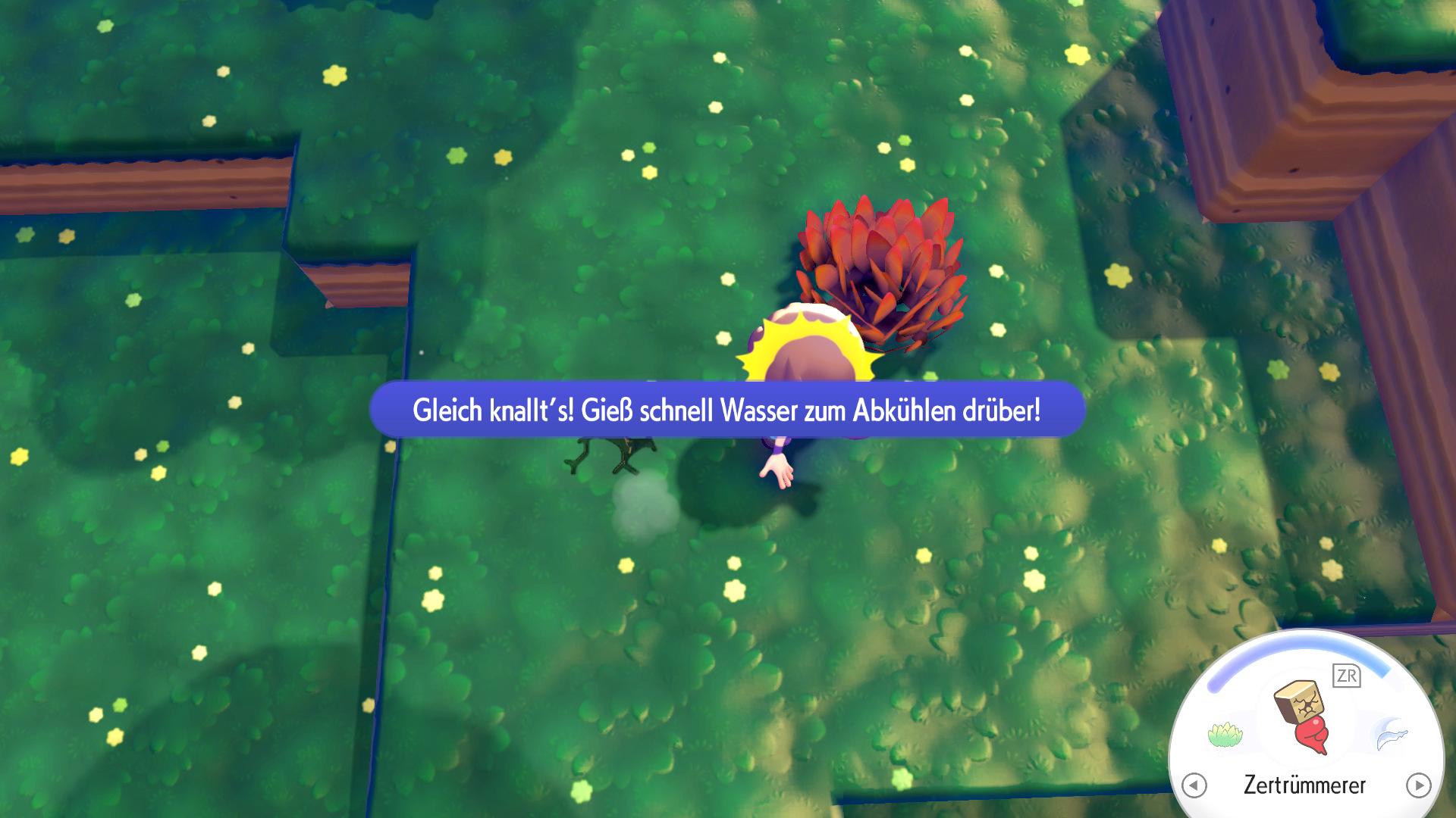 Zufällig kann es vorkommen, dass eine leuchtende Stelle im Boden droht zu explodieren. In diesem Fall werdet ihr mit einem Test auf dem Bildschirm darauf hingewiesen. Sobald eine Explosion droht, habt ihr rund 7,5 Sekunden Zeit diese zu stoppen indem ihr Aquaknarre auf den Block einsetzt. Dadurch wird er gekühlt und ihr könnt das versteckte Item aufheben.