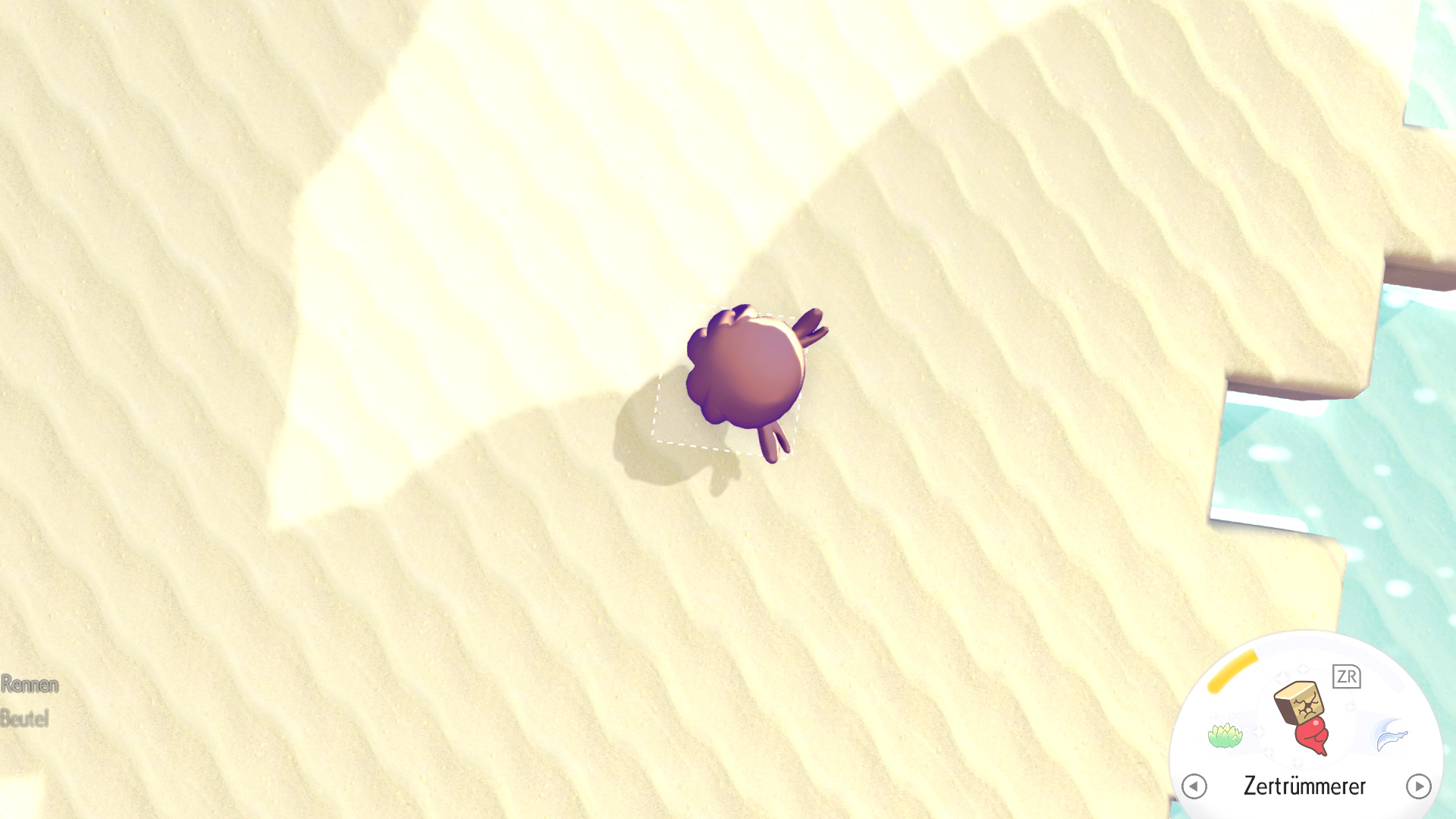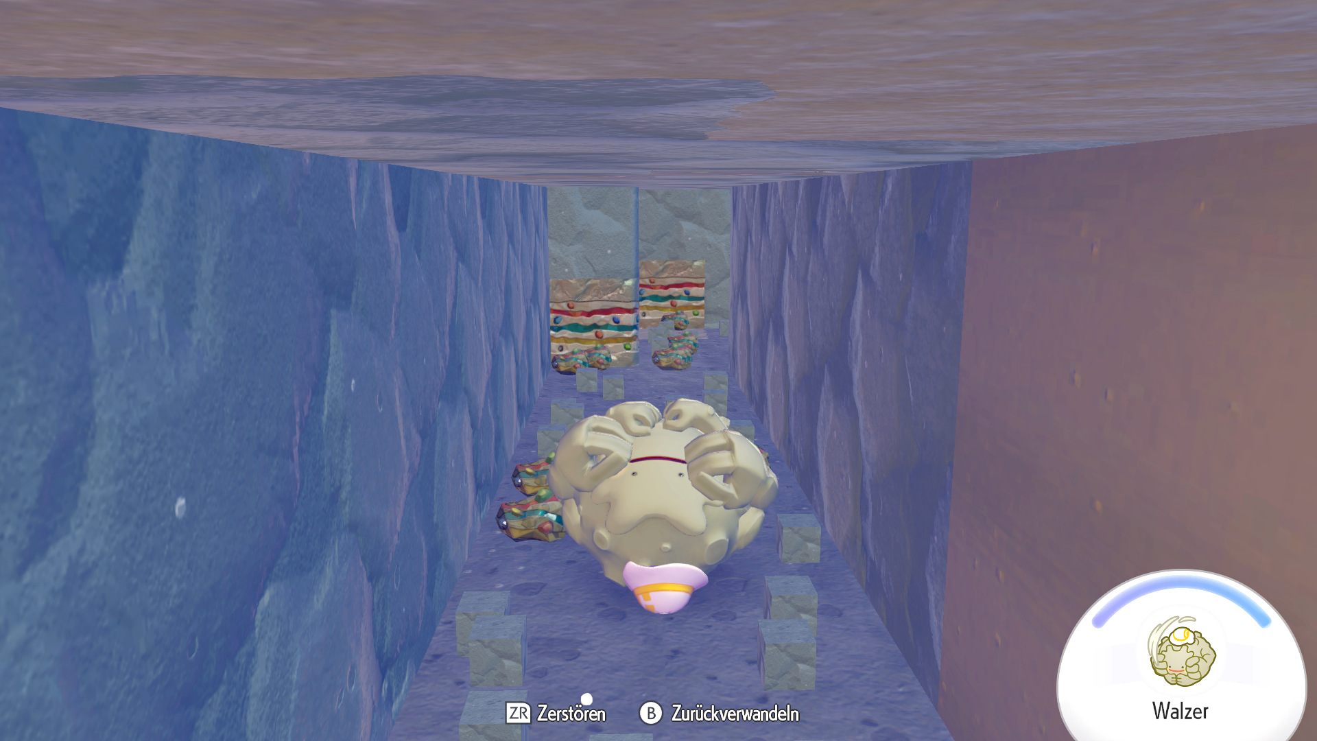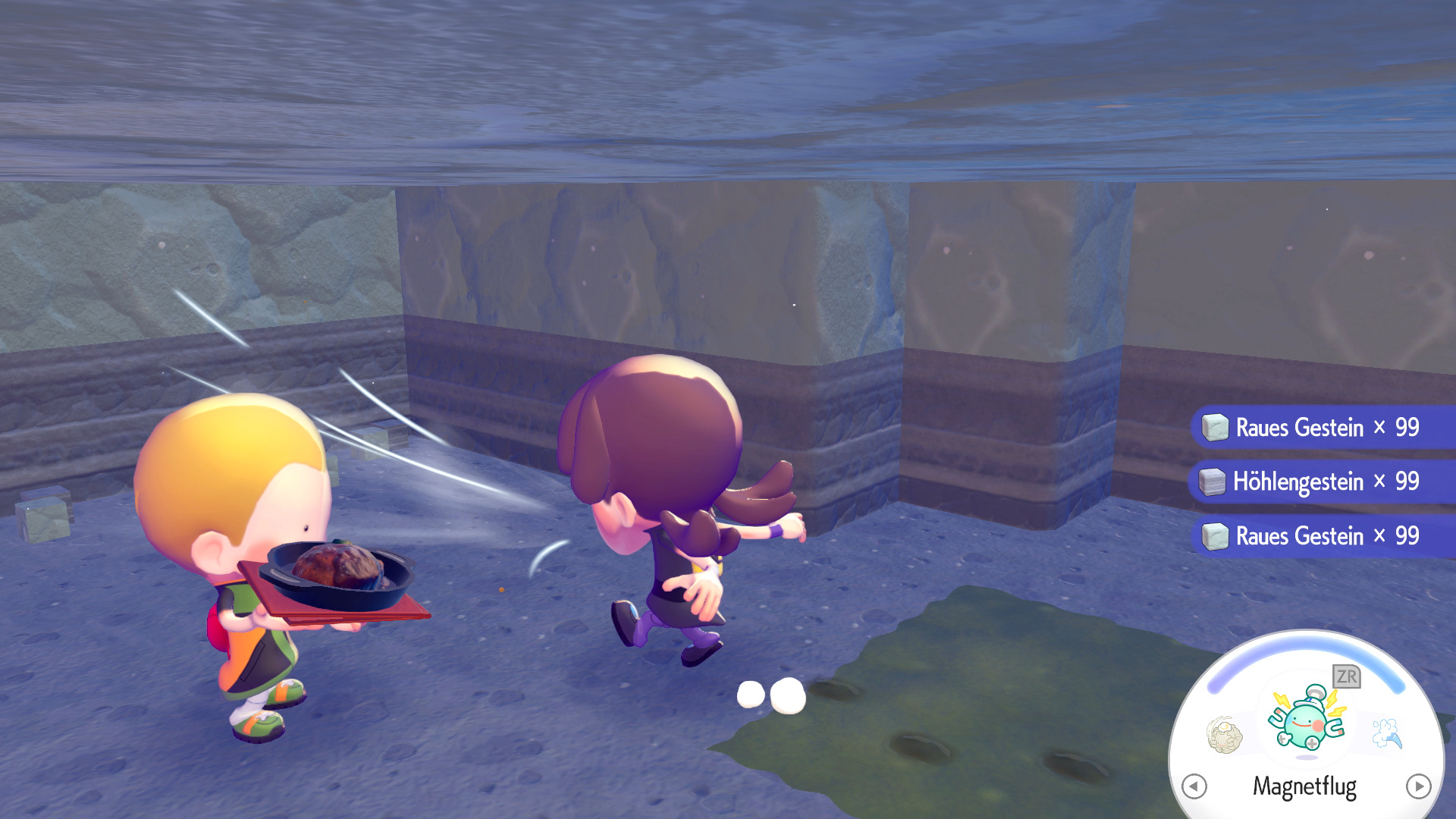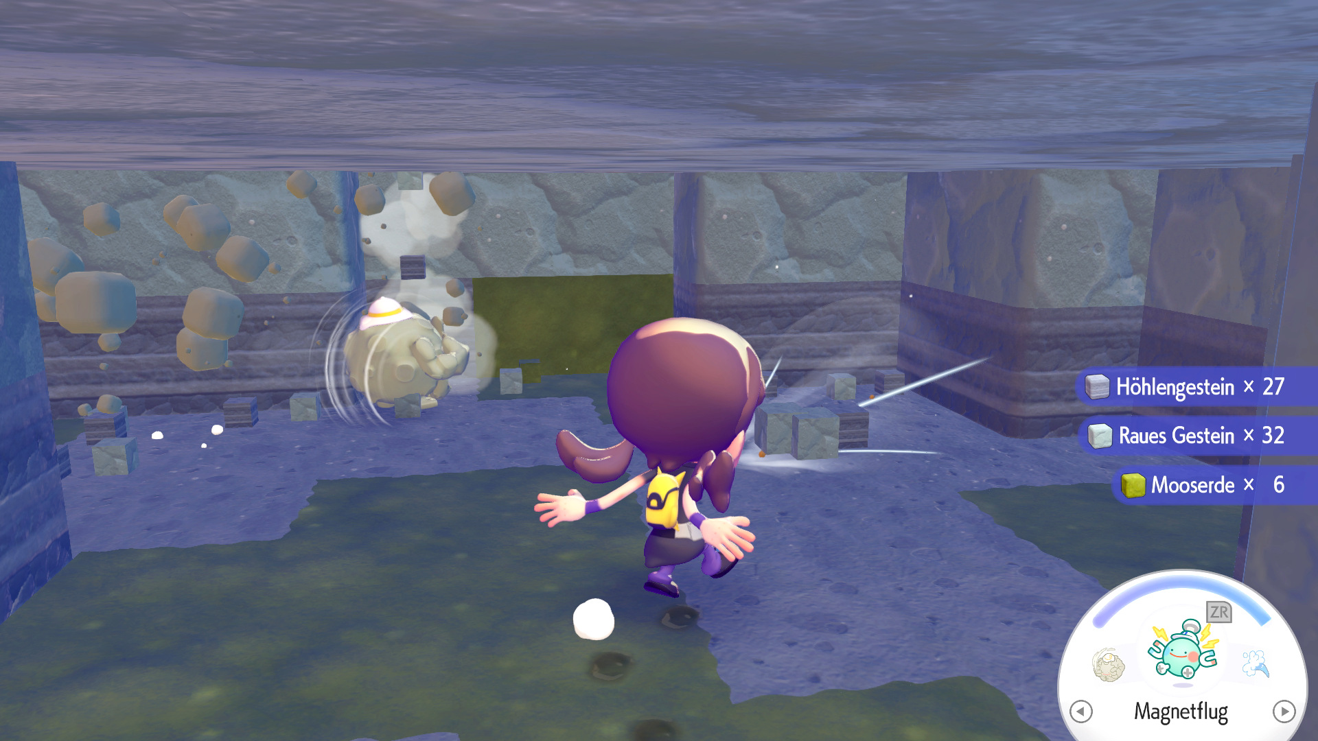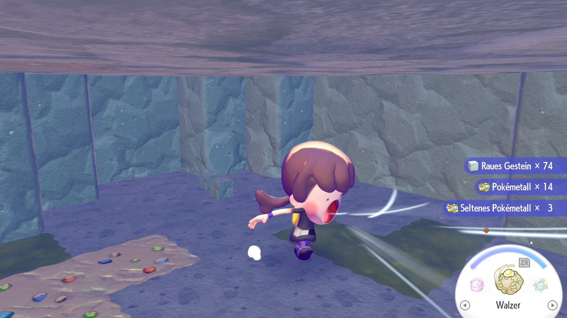 Seid ihr auf der richtigen Tiefe angekommen, esst euren Bratling und rollt mit Georoks Walzer und der Taste ZR gedrückt durch die Wände und zerstört so alle Steine die euch in den Weg kommen. Ihr solltet immer wieder auf die Erze bzw. das Rohmaterial treffen, welches ihr sucht. Rollt einige Zeit umher und zerstört viele Steine, bis ihr euch kurz wieder in eure normale Form verwandelt und die Rohstoffe mit gedrücktem Y aufhebt.