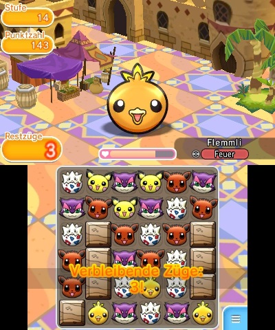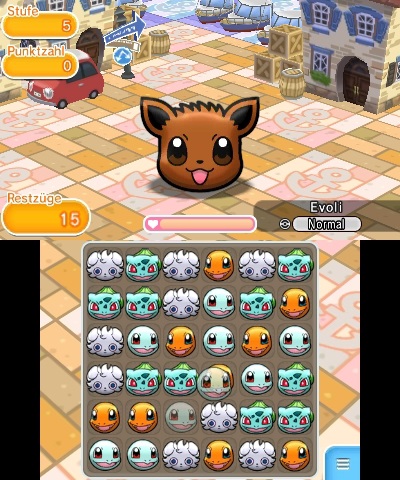 Pokémon Shuffle ist ein Spiel des Puzzle-Genres und setzt sowohl auf Schnelligkeit als auch Geschick. Ziel des Spiel ist es, ein auf dem oberen Bildschirm angezeigtes Pokémon zu besiegen. Dieses gegnerische Pokémon besitzt eine bestimmte Anzahl an KP, die ihr abziehen könnt, indem ihr auf dem Touchscreen Reihen aus drei oder mehr Pokémon bildet. Die Pokémon-Reihen lösen sich auf, sobald diese vervollständigt werden, und ziehen dem Gegner Punkte ab. Hierbei spielt der Typ des Pokémon, mit dem ihr eine Reihe vervollständigt habt, eine große Rolle - so wird in dem Spiel zwischen sehr effektiven und nicht effektiven Attacken unterschieden. Erstere machen mehr Schaden und erleichtern euch so das Besiegen des Pokémon.