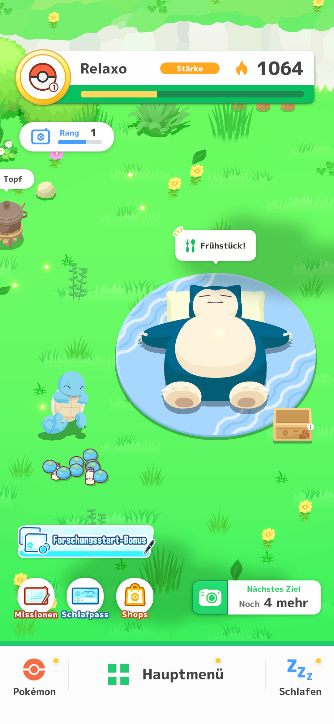 Durch einen Rangaufstieg des eigenen Relaxo haben wir einige Items als Belohnung erhalten, sodass es sich lohnt das wöchentliche Relaxo zu verstärken. Insgesamt konnte unser Relaxo bis zu 20 Level bis zum Rang „Meister 20“ aufsteigen. Außerdem gibt es Missionen, die erledigt werden können, um weitere Belohnungen freizuschalten. Die Missionen umfassen Aufgaben wie Relaxo eine bestimmte Anzahl an Beeren zu geben, sich mit anderen Spielern anzufreunden oder Pokékekse zu verteilen.