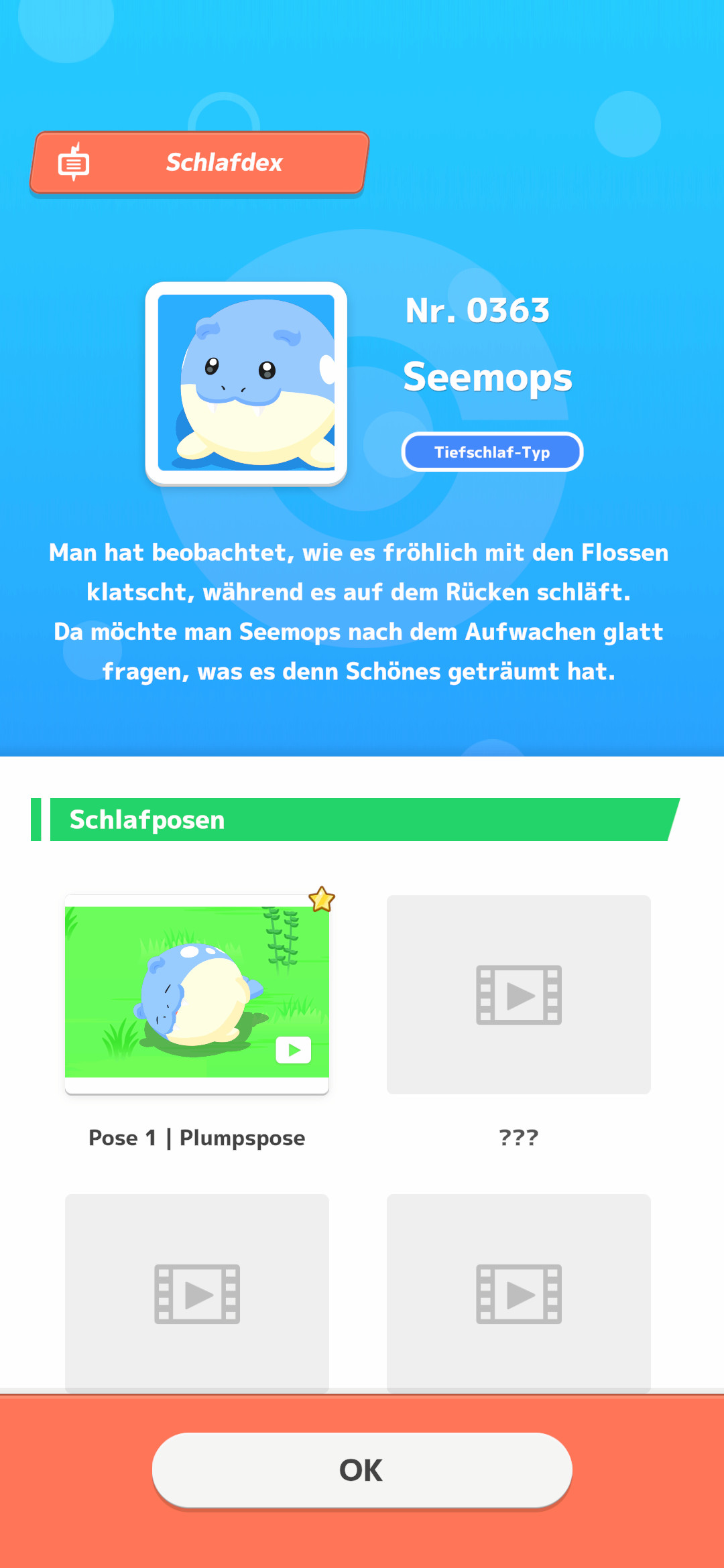 Die so gefundenen Posen der Pokémon werden stets in den Schlafdex eingetragen, der sich somit langsam füllen kann. Die besonderen Posen der Pokémon können im Dex selbst immer wieder angeschaut werden, falls man einen Favoriten haben sollte. Im Schlafdex-Eintrag eines Pokémon ist außerdem stets eine kurze Beschreibung der jeweiligen Pokémon angegeben. Der Eintrag zu Tragosso ist uns dabei am meisten im Gedächtnis geblieben: „Es wird mitunter im Schlaf weinend vorgefunden. Vielleicht träumt es von seiner verstorbenen Mutter.“
