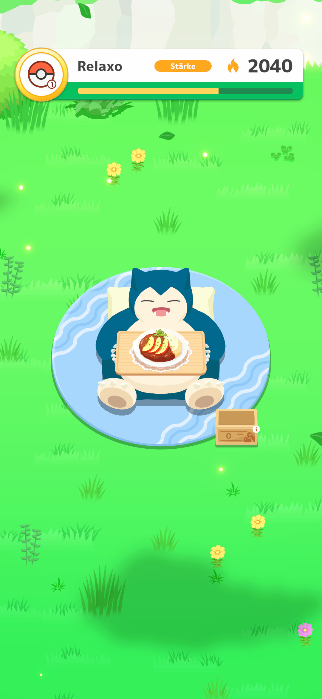 Kaum haben wir das Gericht fertiggekocht, beginnt Relaxo damit, es regelrecht zu verschlingen. Nachdem es sich glücklich wieder hingelegt hat, steigt die Stärke von Relaxo um die Stärke des Gerichts an, welches wir gekocht haben. Ein Gericht kann hierbei auch unterschiedliche Level haben, was offenbar durch das häufige Kochen eines Gerichts beeinflusst werden kann. Die Stärke von Relaxo kann auch durch Beeren erhöht werden, jedoch ist der Anstieg hierbei nicht so groß.