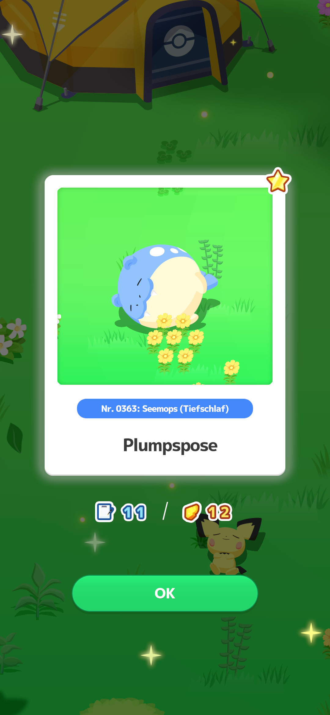 Endlich ist es so weit: Wir können verschiedene Schlafposen von Pokémon entdecken. Hierfür können wir auf einer Wiese, auf der sich bereits auch Relaxo und unser Pikachu befinden, nach neuen Pokémon Ausschau halten. Diese Ansicht, in der wir uns hierbei befinden, ist eine Art Hub des Spiels und dient später für den Ausgangspunkt von vielen App-Inhalten.