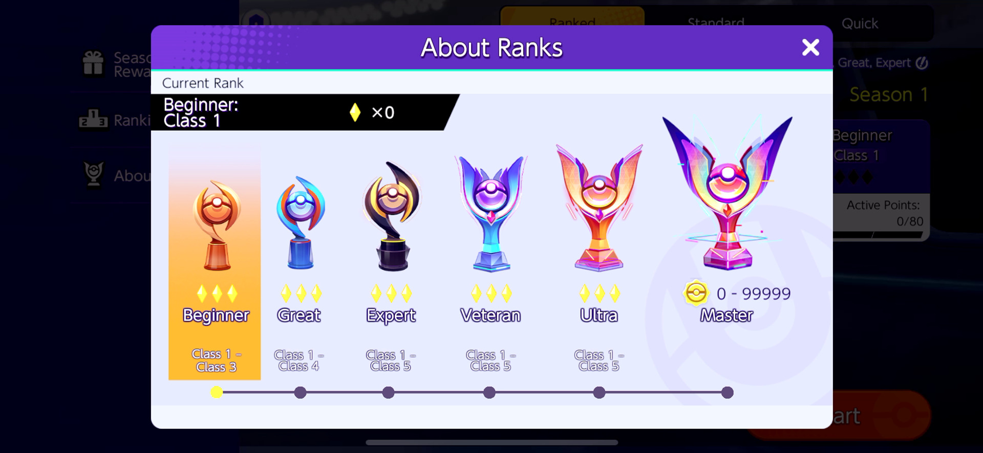 Jeder Spieler startet im Beginner-Rang und kann sich von dort aus hoch arbeiten. Jeder Rang besitzt drei bis fünf Stufen, welche Klasse 1, 2, 3, 4 und 5 genannt werden. Je höher die Zahl desto besser ist die Klasse. Innerhalb dieser Klassen müssen insgesamt drei ♦ gesammelt werden und anschließend ein weiterer Kampf gewonnen werden, um einen Rang aufzusteigen. ♦ können erhalten werden, wenn ein Spiel gewonnen wurde oder wenn die Aktivitätspunkte eine Leiste komplett füllen. ♦ werden verloren, wenn ein Spiel verloren wird. Wird ein Spiel verloren während man keine ♦ besitzt, kann es, wenn die Aktivitätspunkte es nicht verhindern, dazu kommen, dass der Rang des Spielers wieder auf den nächst tieferen Rang fällt.