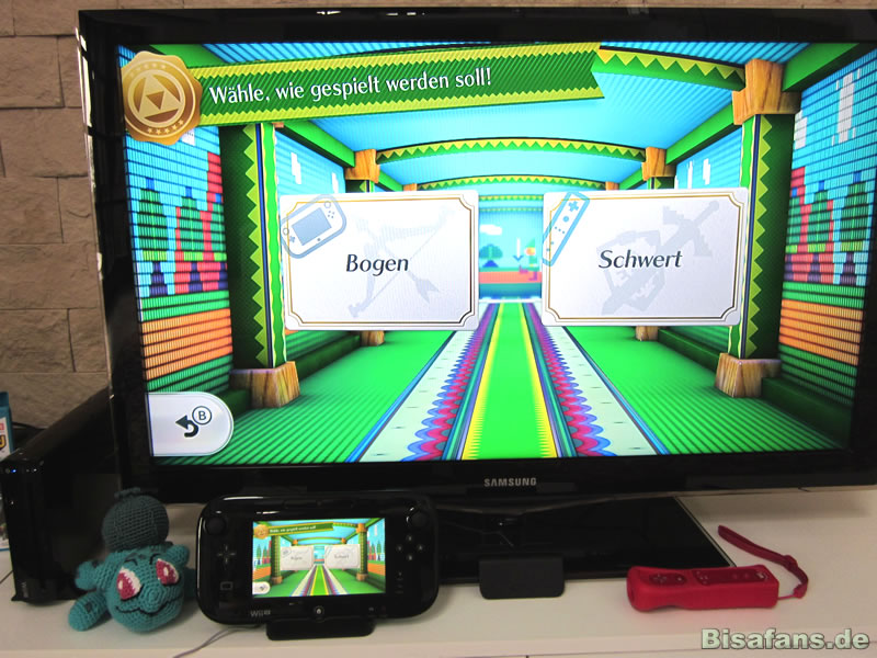 Das Zelda-Spiel ist, genauso wie "Metroid-Schießerei" und "Pikmin-Abenteuer" ein Spiel, welches optional alleine oder mit mehreren Personen spielbar ist. Die Auswahl zu Beginn ist dabei sehr ähnlich, weshalb wir hier beispielhaft Zelda vorstellen. So wählt man zuerst die Anzahl der Spieler, die von der Anzahl der angeschlossenen Geräte abhängig ist. Im Fall von Zelda könnten bis zu vier Spieler mitspielen, wobei nur einer mit GamePad spielt, alle anderen mit Wii Remote Controllern. Der zweite Auswahl-Bildschirm fragt beim Solospiel, ob man Zelda mit GamePad oder Remote Controller spielen will. Dies ist keine Frage der Vorliebe bei der Steuerung, sondern eine grundlegende Frage, wie man überhaupt spielen möchte. Denn nur mit GamePad kann man Zelda als Bogenschütze spielen, während man mit einem Remote Controller als Schwertkämpfer spielt. In anderen Spielen wie Metroid, entscheidet diese Wahl zwischen Luftkampf und Bodenkampf!